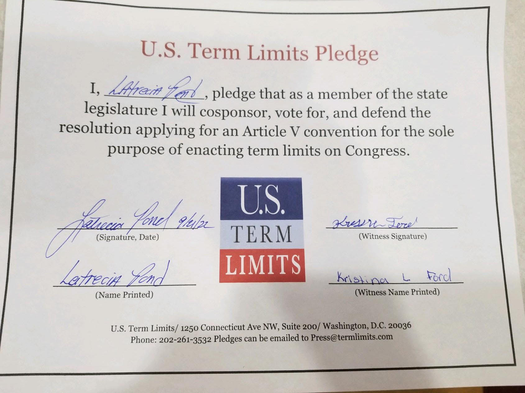 USTL President, Philip Blumel, commented on Pond’s pledge saying, “Letricia’s support of term limits shows that there are individuals who are willing to listen to the majority of voters who want term limits. America needs a Congress that will be served by citizen legislators, not career politicians.”