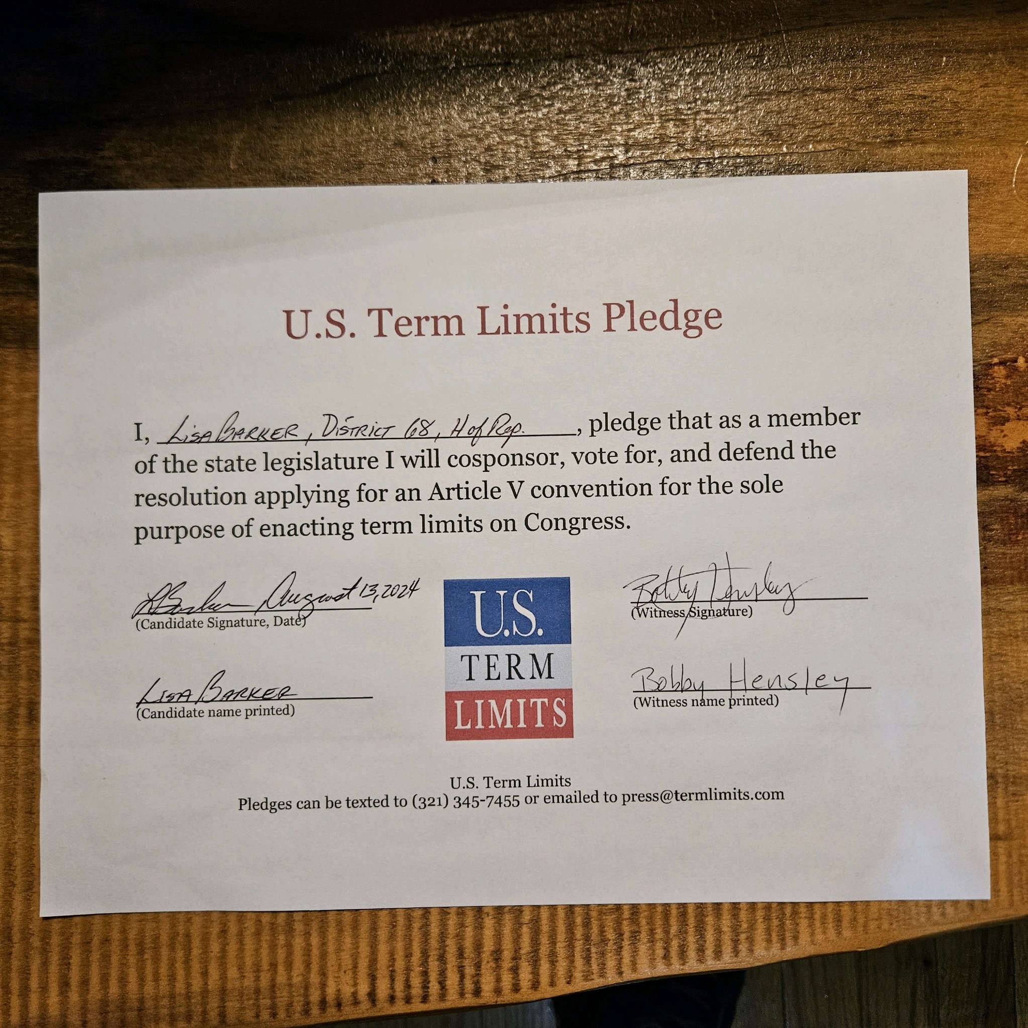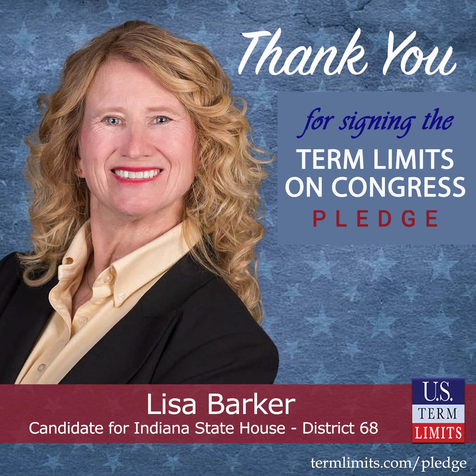 USTL President, Philip Blumel, commented on Barker’s pledge saying, “Lisa’s strong support of term limits shows that there are individuals who are willing to listen to the majority of voters who want term limits. America needs a Congress that will be served by citizen legislators, not career politicians.”