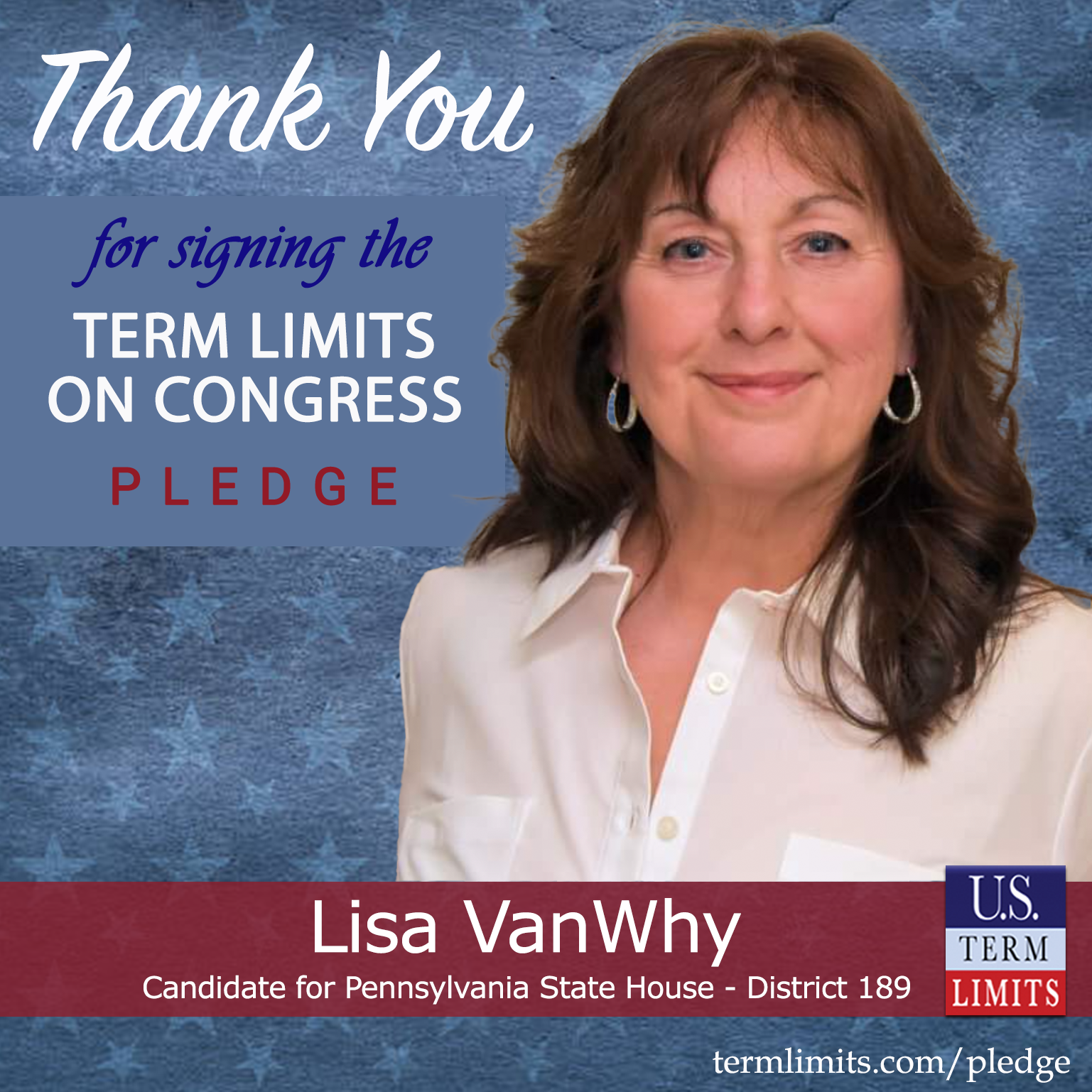 State Co-Chair for U.S. Term Limits, John Eichelberger, commented on VanWhy’s pledge saying, “Our founding fathers never envisioned a professional class of politicians. I am glad Lisa agrees. She is committed to implementing term limits on Congress.”