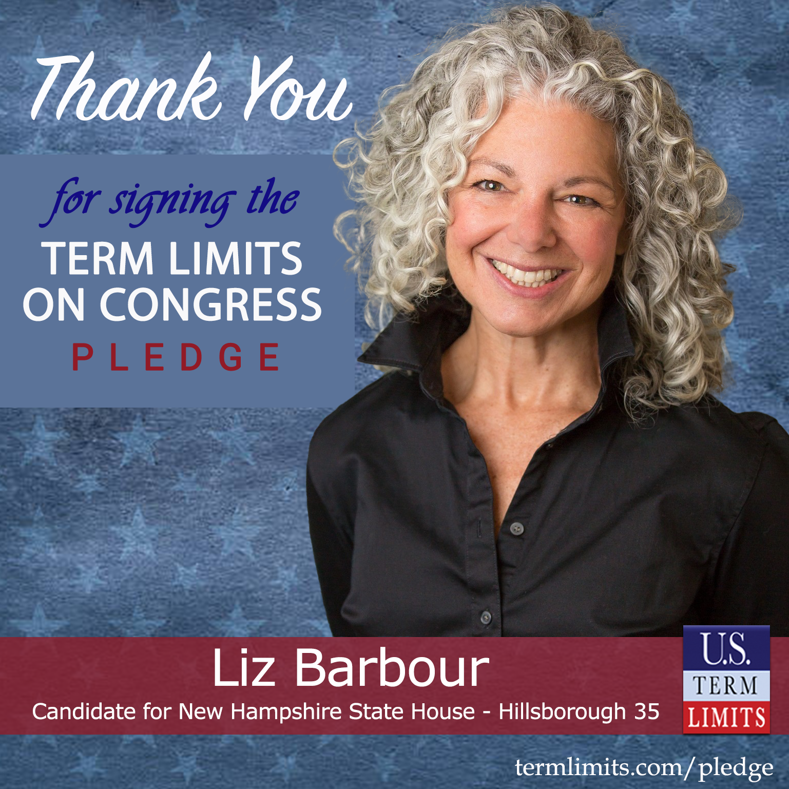 Hollis, NH – U.S. Term Limits (USTL), the leader in the national, non-partisan movement to limit terms for elected officials, is gathering support from state lawmakers across the nation. Its mission is to get 34 states to apply for an amendment proposal convention specific to term limits on Congress. New Hampshire state house candidate, Liz Barbour (Hillsborough 35), has committed support for term limits on Congress by signing the term limits convention pledge. Previously, candidate Sue Homola also signed the pledge.