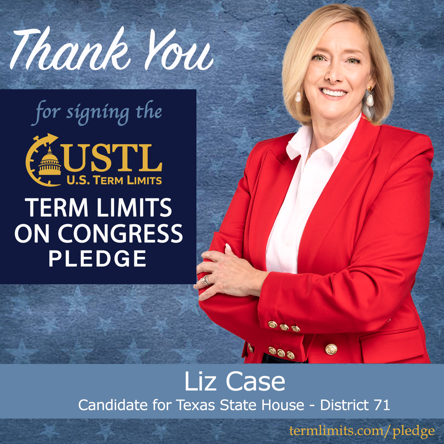 Abilene, TX – U.S. Term Limits (USTL), the leader in the national, non-partisan movement to limit terms for elected officials, is gathering support from state lawmakers across the nation. Its mission is to get 34 states to apply for an amendment proposal convention specific to term limits on Congress. Texas state house candidate, Liz Case (district 71), has committed support for term limits on Congress by signing the term limits convention pledge.