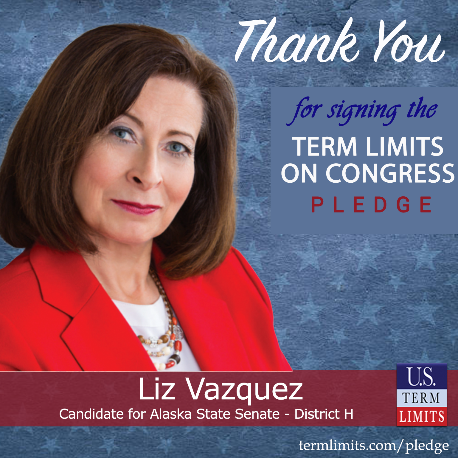 Anchorage, AK – U.S. Term Limits (USTL), the leader in the national, non-partisan movement to limit terms for elected officials, is gathering support from state lawmakers across the nation. Its mission is to get 34 states to apply for an amendment proposal convention specific to term limits on Congress. Alaska state senate candidate, Liz Vazquez (District H), has committed support for term limits on Congress by signing the term limits convention pledge.