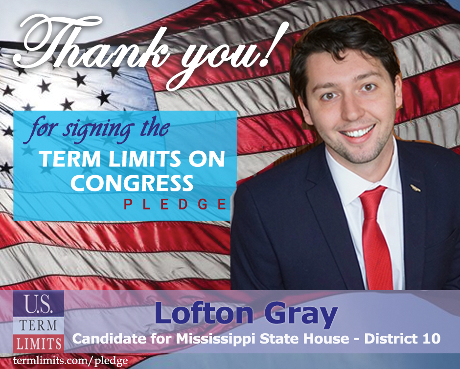 Jackson, MS – U.S. Term Limits (USTL), the leader in the national, non-partisan movement to limit terms for elected officials, is gathering support from state lawmakers across the nation. Its mission is to get 34 states to apply for an amendment proposal convention specific to term limits on Congress. Mississippi state house candidate, Lofton Gray (district 10), has committed support for term limits on Congress by signing the Term Limits Convention pledge.