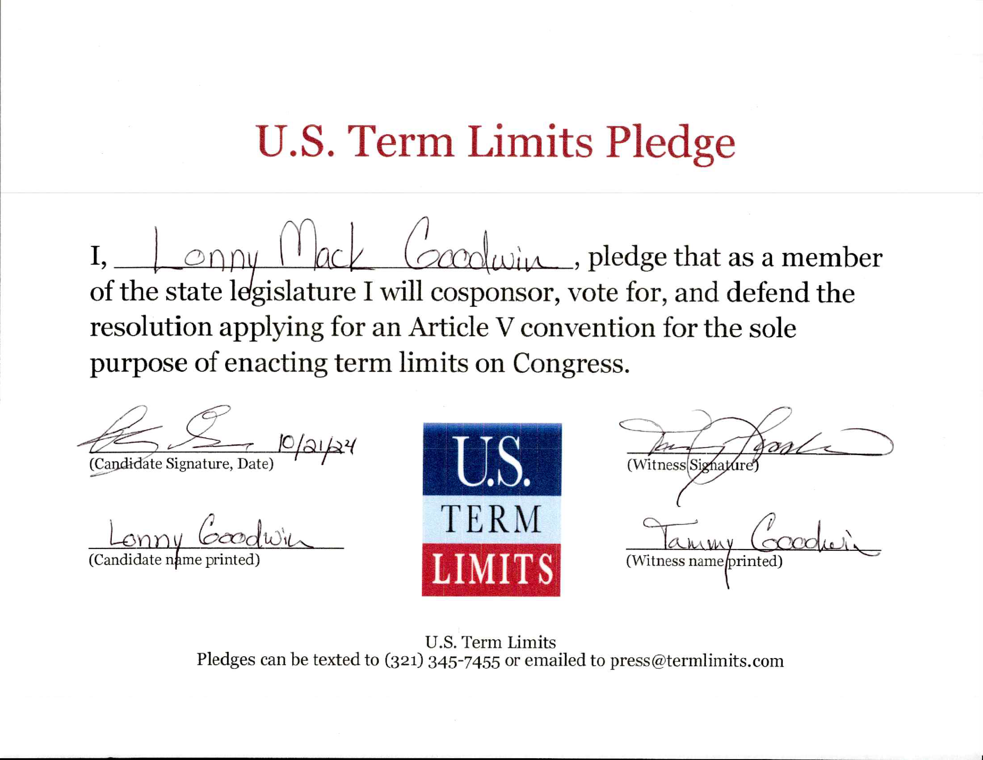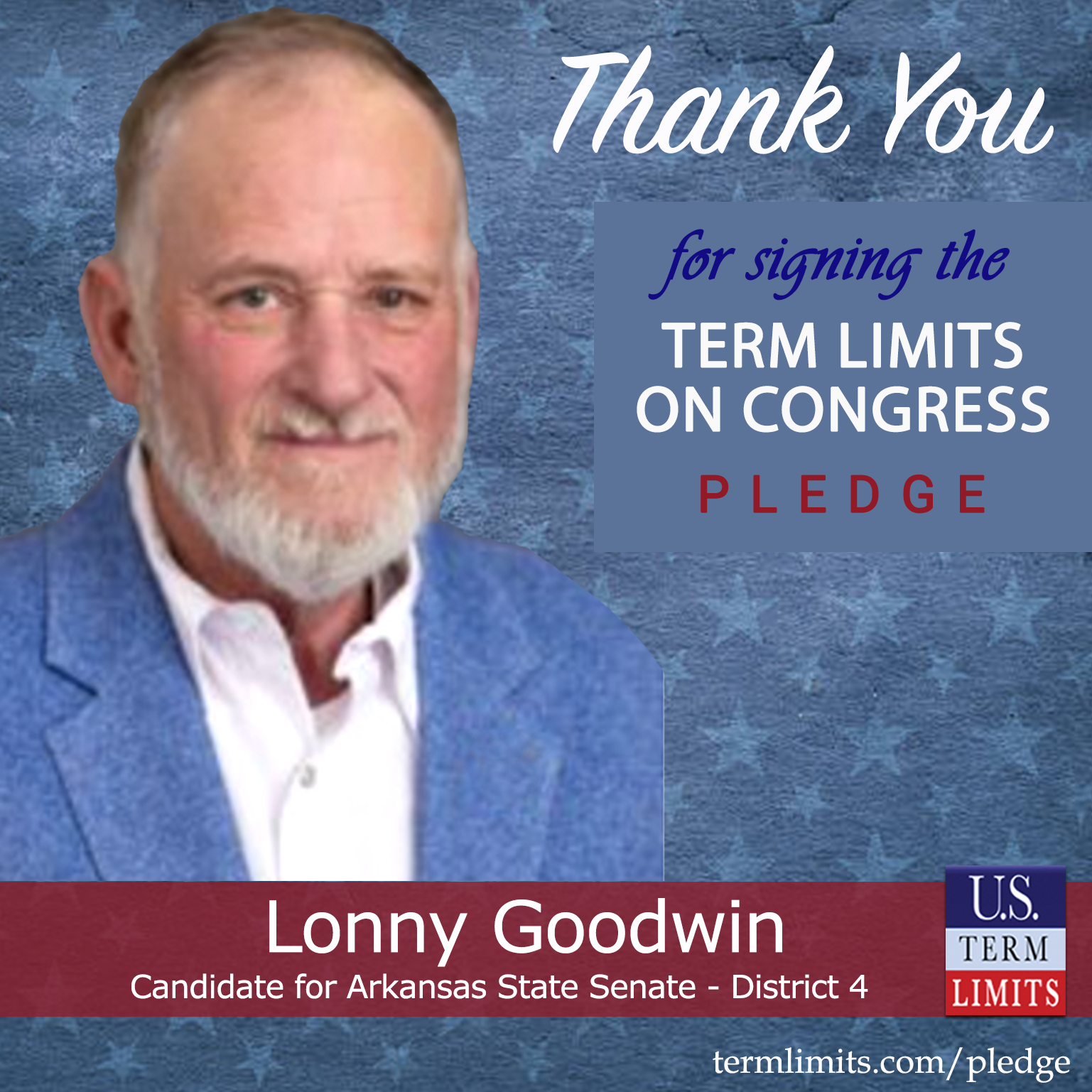 Texarkana, AR – U.S. Term Limits (USTL), the leader in the national, non-partisan movement to limit terms for elected officials, is gathering support from state lawmakers across the nation. Its mission is to get 34 states to apply for an amendment proposal convention specific to term limits on Congress. Arkansas state senate candidate, Lonny Goodwin (district 4), has committed support for term limits on Congress by signing the term limits convention pledge.