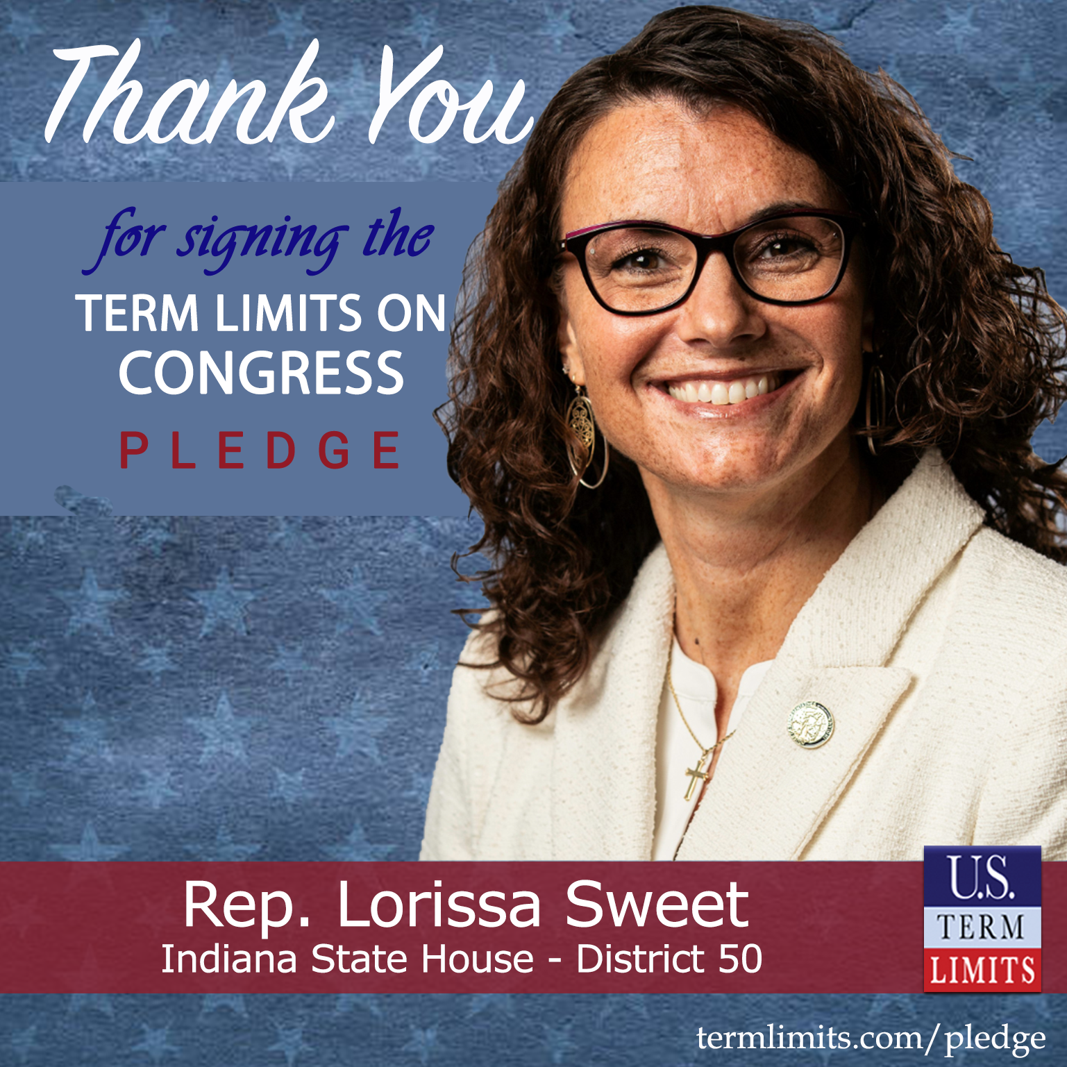 Indianapolis, IN – U.S. Term Limits (USTL), the leader in the national, non-partisan movement to limit terms for elected officials, is gathering support from state lawmakers across the nation. Its mission is to get 34 states to apply for an amendment proposal convention specific to term limits on Congress. Indianapolis state house Rep. Lorissa Sweet (District 50), has committed support for term limits on Congress by signing the term limits convention pledge.