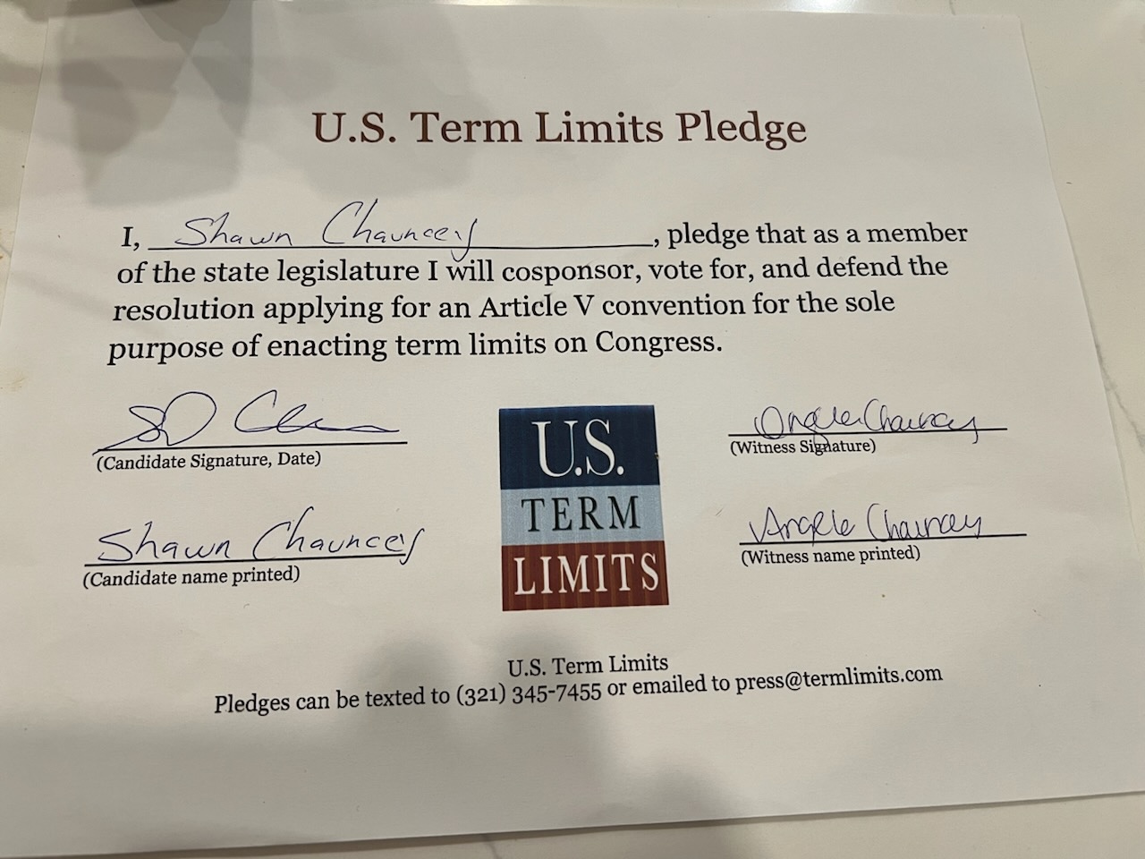 The U.S. Term Limits pledge is provided to candidates and members of state legislatures. It reads, “I pledge that, as a member of the state legislature, I will cosponsor, vote for, and defend the resolution applying for an Article V convention for the sole purpose of enacting term limits on Congress.”