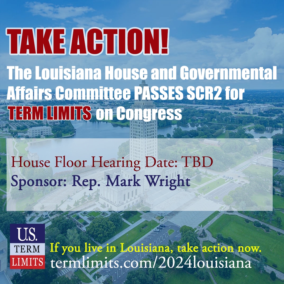 Baton Rouge, LA — The Louisiana House and Governmental Affairs Committee passed Senate Concurrent Resolution 2 (SCR2), which notifies Congress that Louisiana seeks to participate in an amendment convention for the sole purpose of proposing a congressional term limits amendment to the U.S. Constitution.  The effort led by Representative Mark Wright (district 77) and spearheaded by the nonpartisan nonprofit U.S. Term Limits passed by acclamation.
