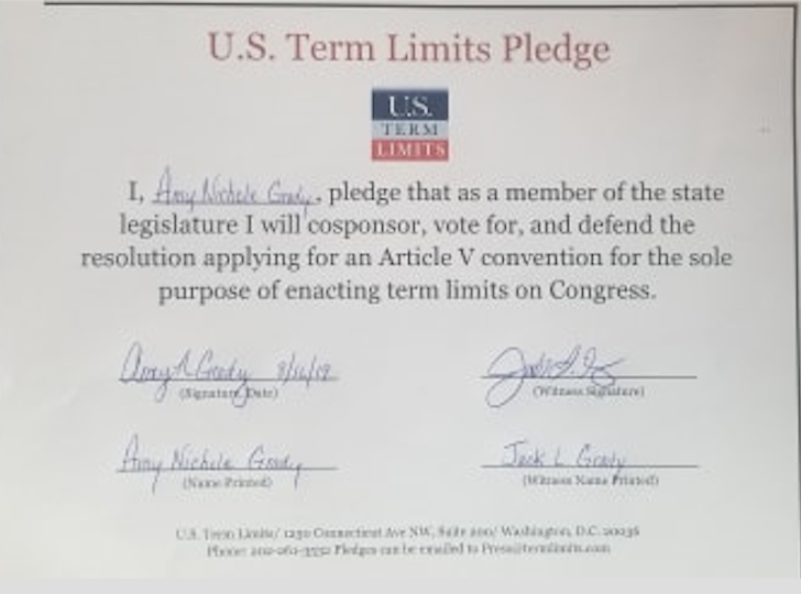 The U.S. Term Limits pledge is provided to candidates and members of state legislatures. It reads, “I pledge that, as a member of the state legislature, I will cosponsor, vote for, and defend the resolution applying for an Article V convention for the limited purpose of enacting term limits on Congress.”