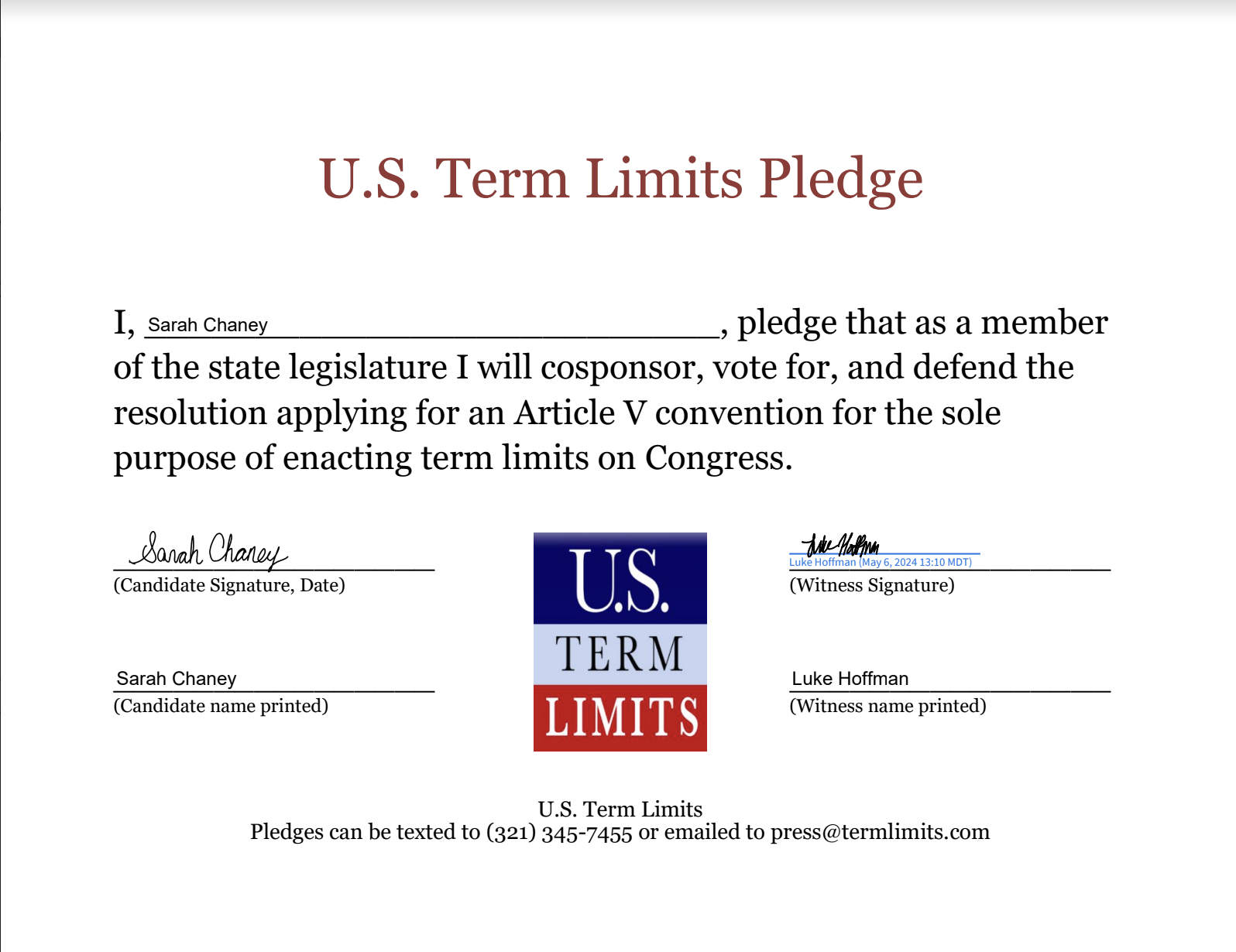 The U.S. Term Limits pledge is provided to candidates and members of state legislatures. It reads, “I pledge that, as a member of the state legislature, I will cosponsor, vote for, and defend the resolution applying for an Article V convention for the sole purpose of enacting term limits on Congress.”