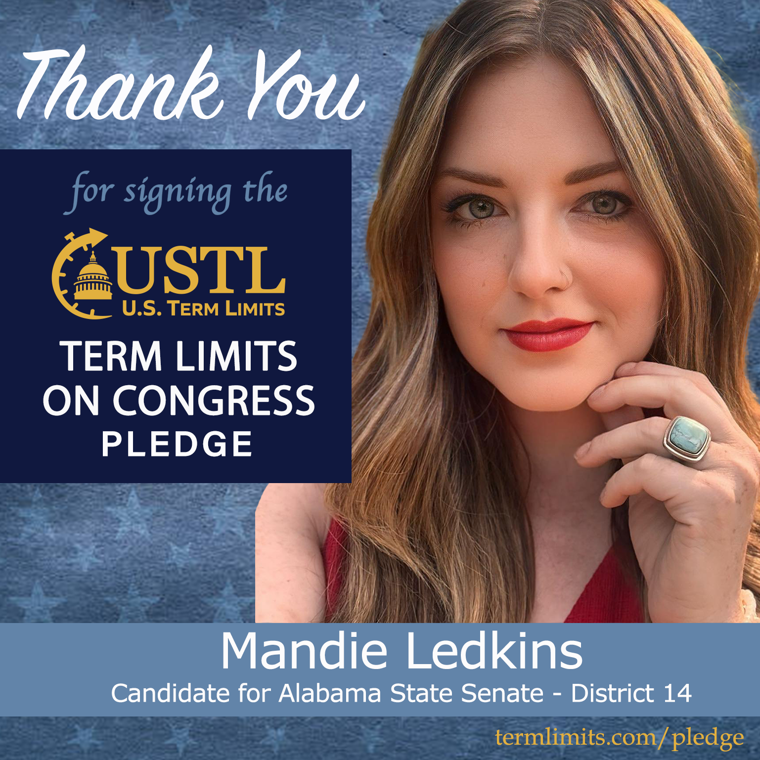 Cordova, AL – U.S. Term Limits (USTL), the leader in the national, non-partisan movement to limit terms for elected officials, is gathering support from state lawmakers across the nation. Its mission is to get 34 states to apply for an amendment proposal convention specific to term limits on Congress. 2026 Alabama state senate candidate, Mandie Ledkins (district 14), has committed support for term limits on Congress by signing the term limits convention pledge.