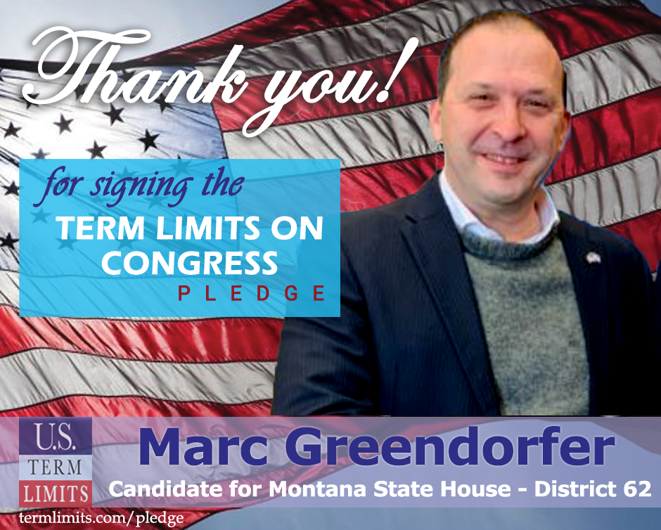 Bozeman, MT – U.S. Term Limits (USTL), the leader in the national, non-partisan movement to limit terms for elected officials, is gathering support from state lawmakers across the nation. Its mission is to get 34 states to apply for an amendment proposal convention specific to term limits on Congress. Montana state house candidate, Marc Greendorfer (district 62) has committed support for term limits on Congress by signing the Term Limits Convention pledge. Greendorfer is the first signer in this race.
