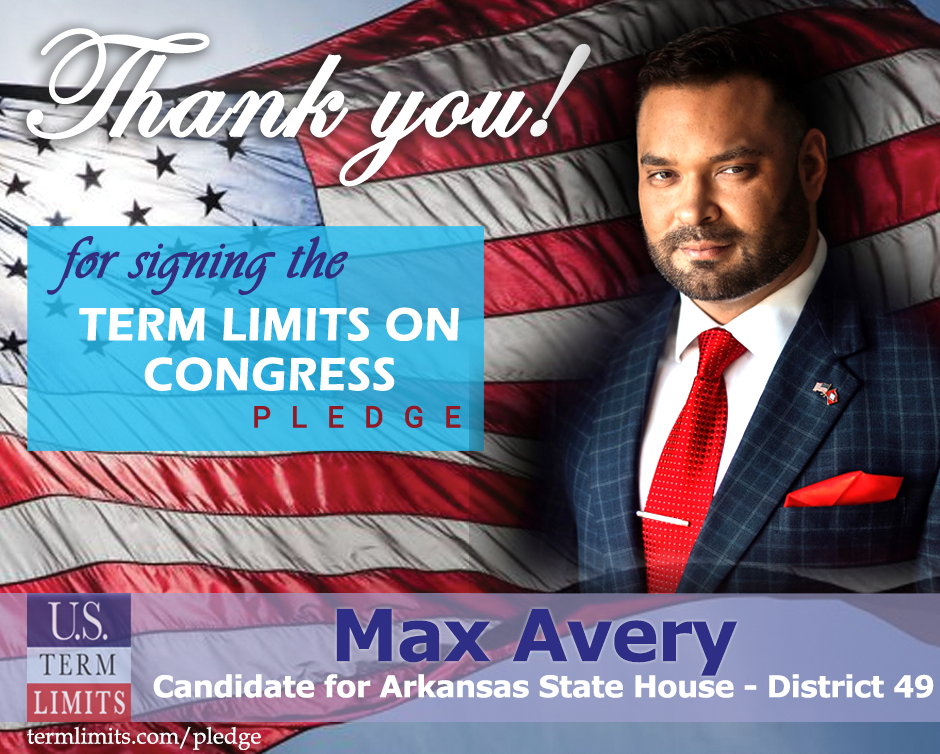 The U.S. Term Limits pledge is provided to candidates and members of state legislatures. It reads, “I pledge that, as a member of the state legislature, I will cosponsor, vote for, and defend the resolution applying for an Article V convention for the limited purpose of enacting term limits on Congress.”