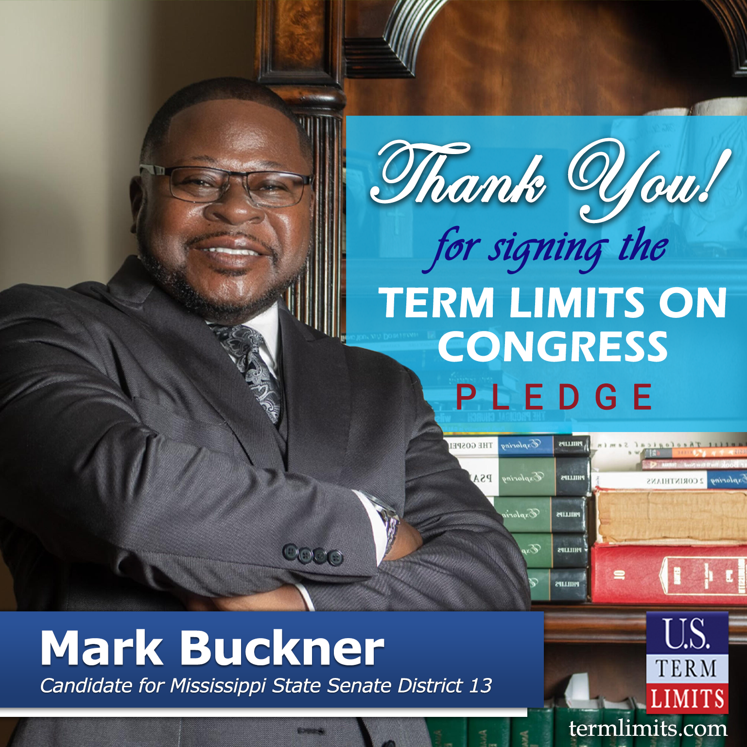 Jackson, MS – U.S. Term Limits (USTL), the leader in the national, non-partisan movement to limit terms for elected officials, is gathering support from state lawmakers across the nation. Its mission is to get 34 states to apply for an amendment proposal convention specific to term limits on Congress. Mississippi state senate candidate, Mark Buckner (District 13), has committed support for term limits on Congress by signing the Term Limits Convention pledge.