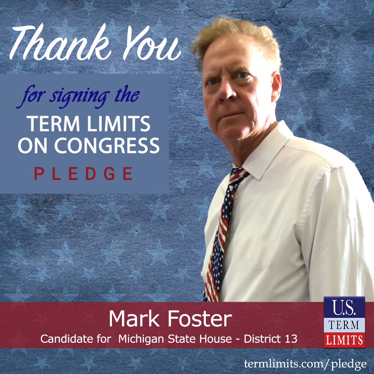 Lansing, MI – U.S. Term Limits (USTL), the leader in the national, non-partisan movement to limit terms for elected officials, is gathering support from state lawmakers across the nation. Its mission is to get 34 states to apply for an amendment proposal convention specific to term limits on Congress. Michigan state house candidate, Mark Foster (District 13), has committed support for term limits on Congress by signing the Term Limits Convention Pledge. Previously, candidate Patricia Singleton also signed the pledge.