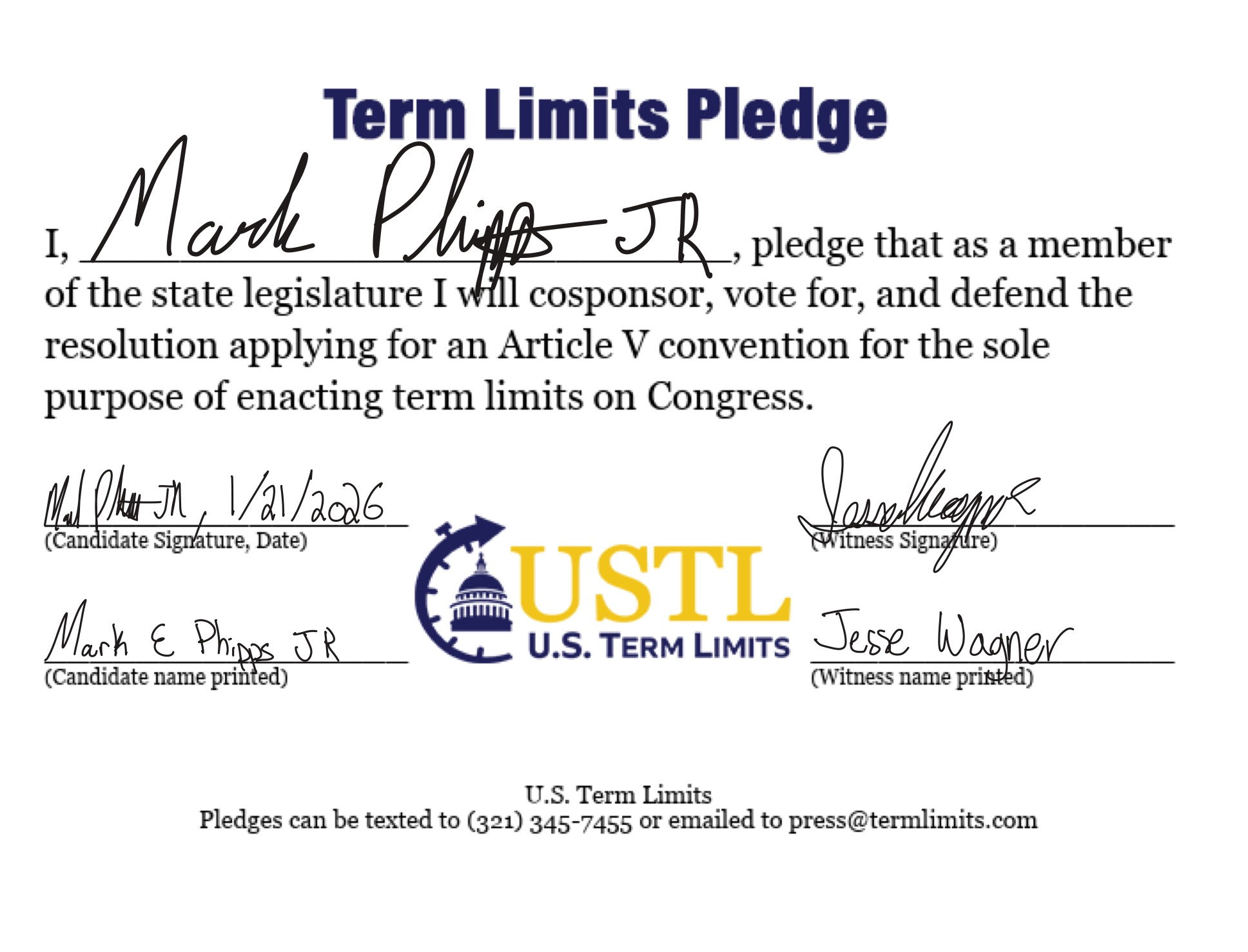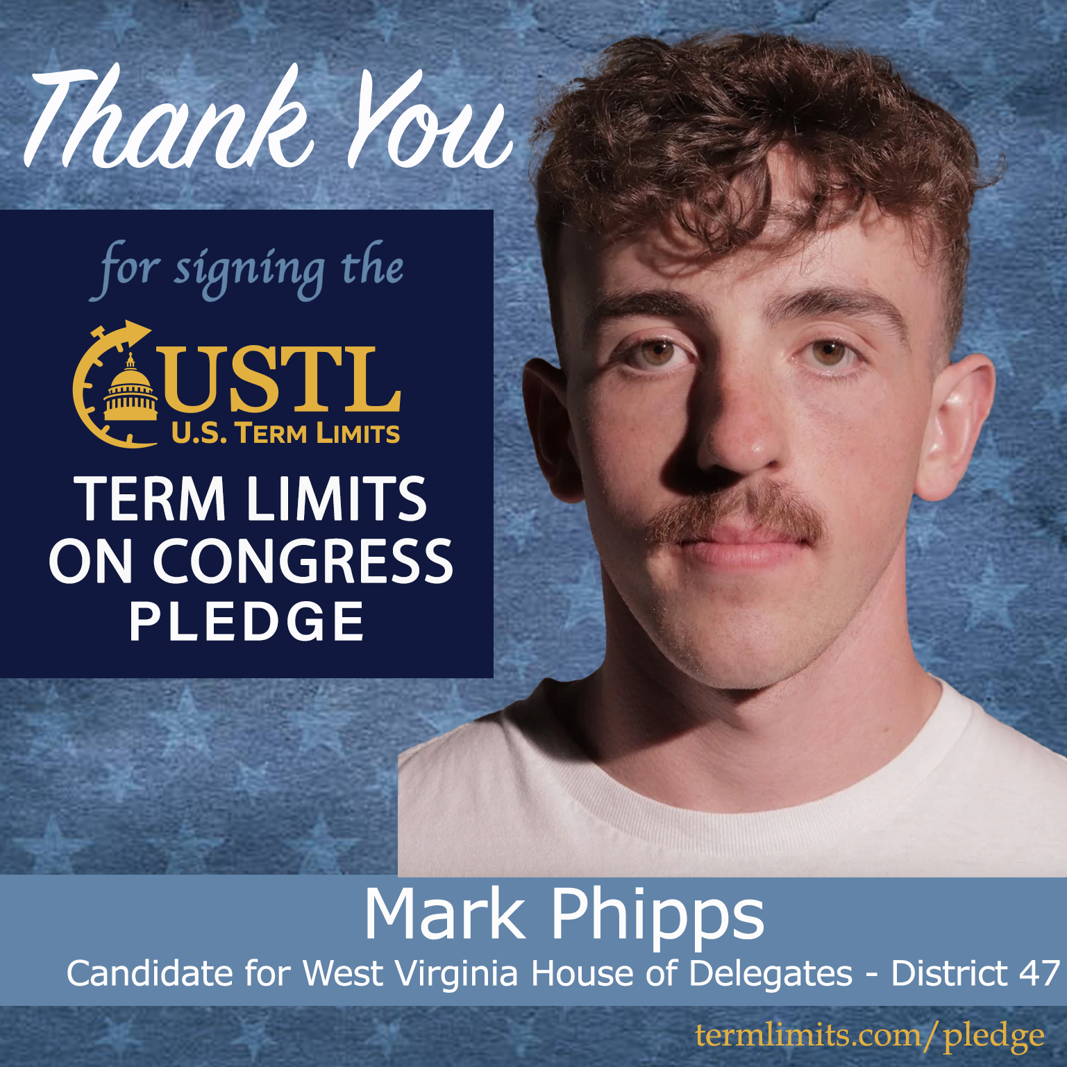 Rainelle, WV – U.S. Term Limits (USTL), the leader in the national, non-partisan movement to limit terms for elected officials, is gathering support from state lawmakers across the nation. Its mission is to get 34 states to apply for an amendment proposal convention specific to term limits on Congress. West Virginia house of delegates candidate, Mark Phipps (district 47), has committed support for term limits on Congress by signing the term limits convention pledge.