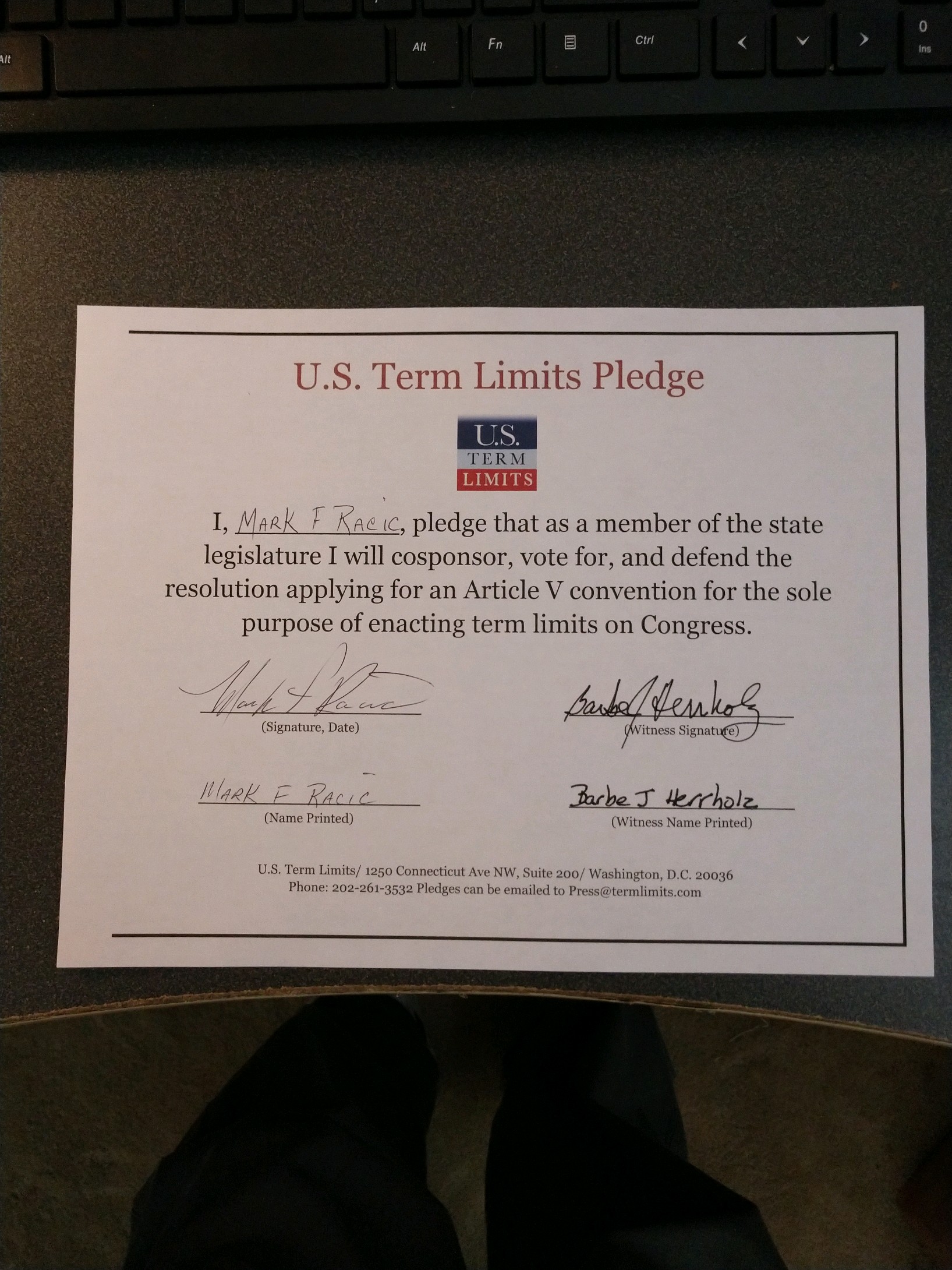 Rochester, NH – U.S. Term Limits (USTL), the leader in the national, non-partisan movement to limit terms for elected officials, is gathering support from state lawmakers across the nation. Its mission is to get 34 states to apply for an amendment proposal convention specific to term limits on Congress. New Hampshire state house candidate, Mark Racic (Strafford 6), has committed support for term limits on Congress by signing the Term Limits Convention pledge.