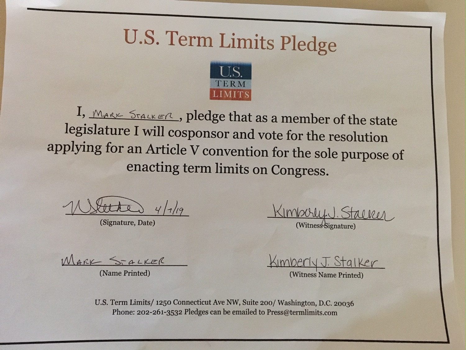 U.S. Term Limits Praises Mark Stalker for Signing Pledge