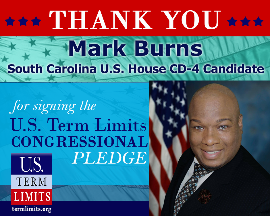 Summerville, SC – U.S. Term Limits (USTL), the leader in the national movement to limit terms for elected officials, today praised South Carolina U.S. House CD-4 candidate, Mark Burns, for signing its congressional term limits pledge. Previously, candidates Stephen Brown, Dan Albert, Shannon Pierce, Lee Bright, Josh Kimbrell, Daniel Hamilton and William Timmons also committed their support to proposing an amendment to term limit Congress. The congressional seat is being vacated by Trey Gowdy who has also signed the term limits pledge and has scored an A rating on the USTL Legislator Scorecard.
