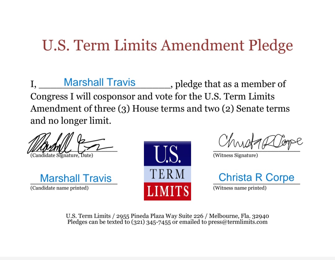U.S. Term Limits has the support of more than 130 pledge signers in Congress. USTL President Philip Blumel commented on Travis’s pledge saying, “Marshall’s strong support of term limits shows that there are individuals who are willing to put self-interest aside to follow the will of the people. America needs a Congress that will be served by citizen legislators, not career politicians.”
