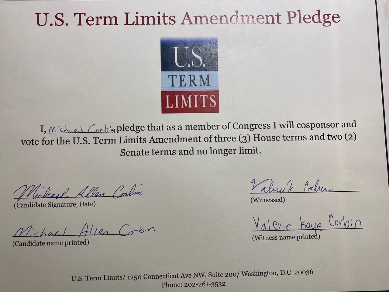 U.S. Term Limits has the support of more than 90 pledge signers in Congress. USTL President Philip Blumel commented on West’s and Corbin’s pledges saying, “Mary’s and Michael’s strong support of term limits shows that there are individuals who are willing to put self-interest aside to follow the will of the people. America needs a Congress that will be served by citizen legislators, not career politicians.”