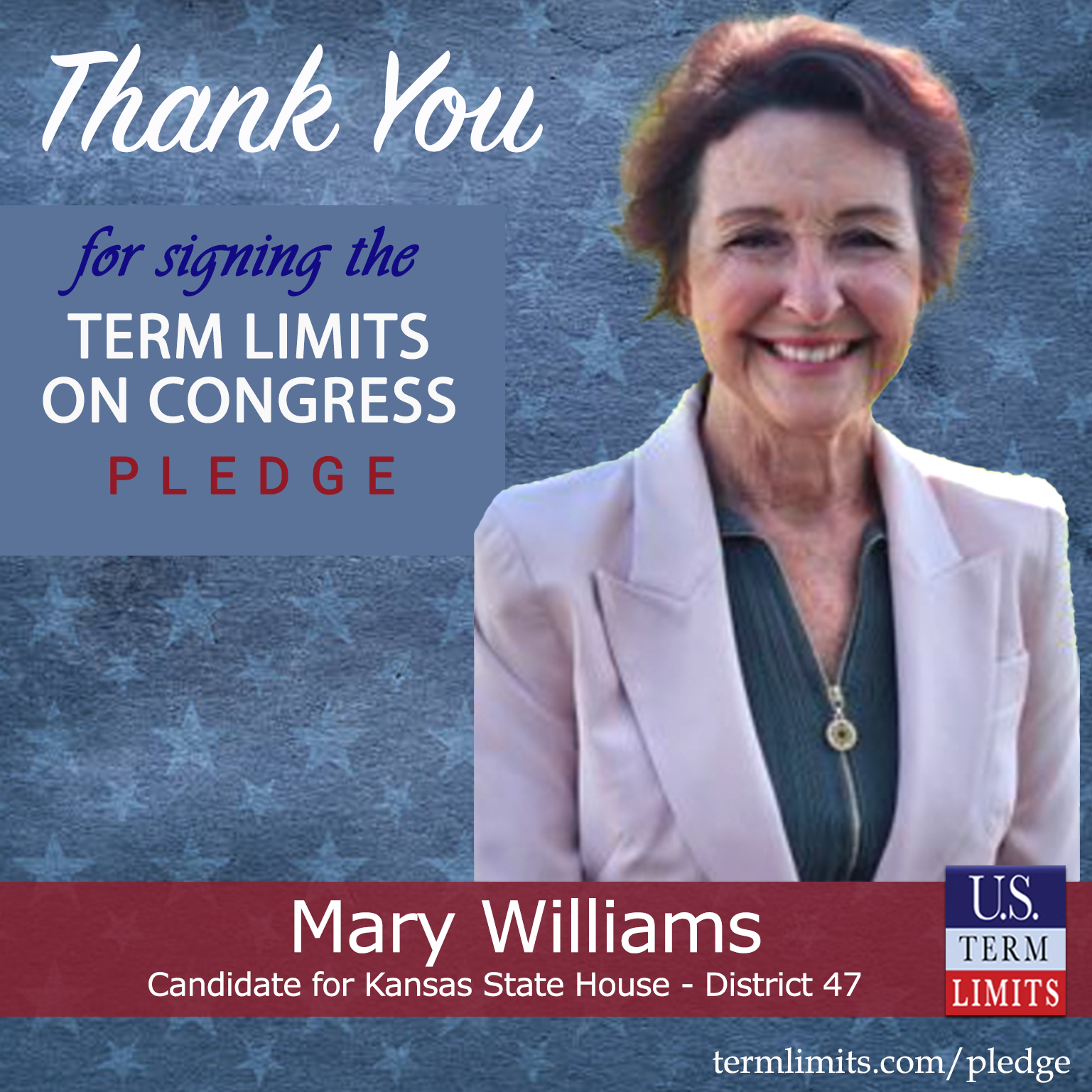 Meriden, KS – U.S. Term Limits (USTL), the leader in the national, non-partisan movement to limit terms for elected officials, is gathering support from state lawmakers across the nation. Its mission is to get 34 states to apply for an amendment proposal convention specific to term limits on Congress. Kansas state house candidate, Mary Williams (District 47), has committed support for term limits on Congress by signing the Term Limits Convention Pledge.