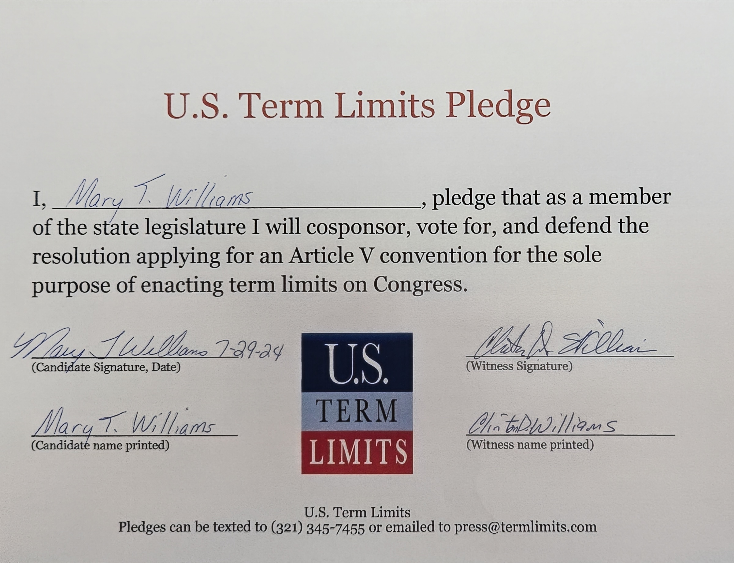 Mary Williams Pledges to Support Congressional Term Limits