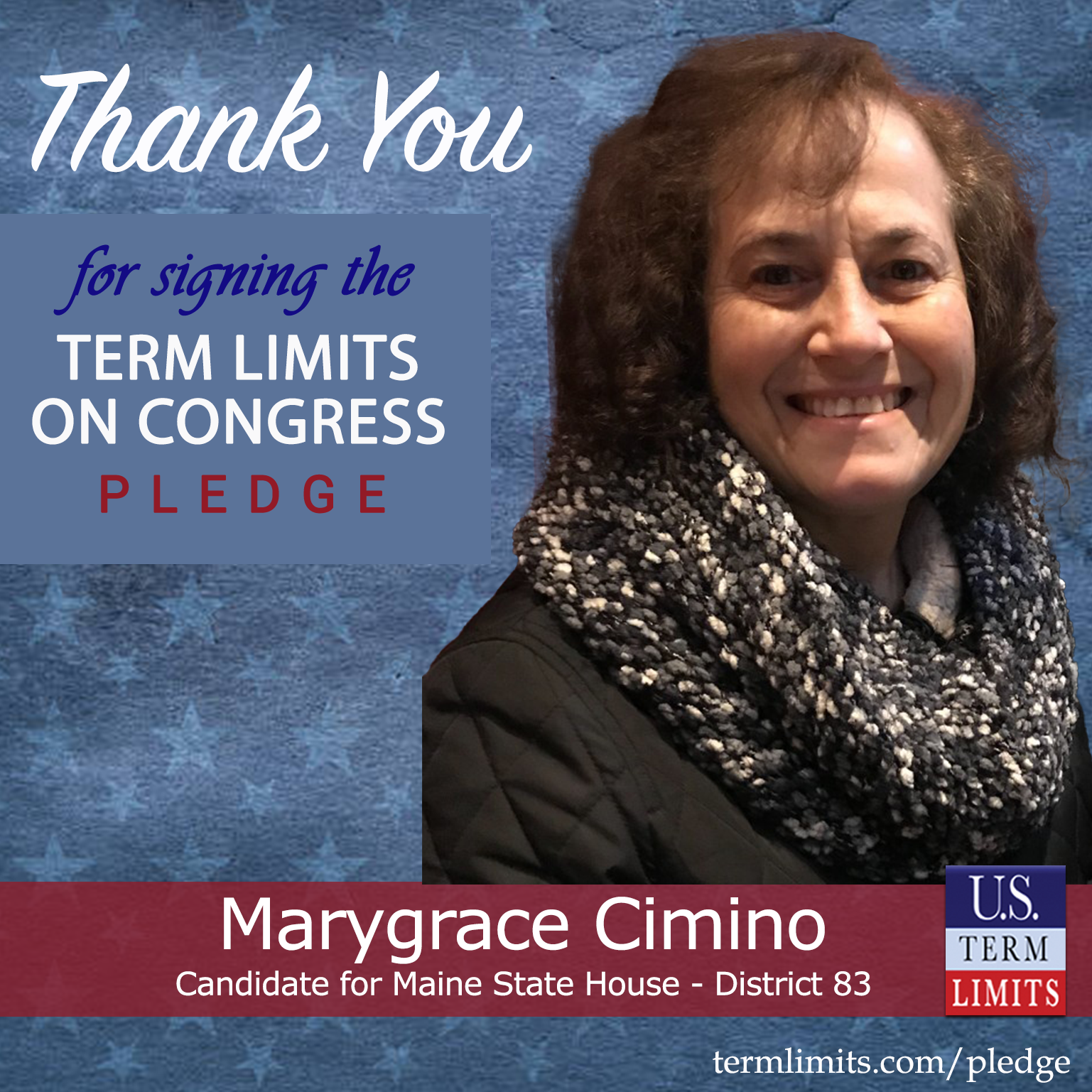 Bridgton, ME – U.S. Term Limits (USTL), the leader in the national, non-partisan movement to limit terms for elected officials, is gathering support from state lawmakers across the nation. Its mission is to get 34 states to apply for an amendment proposal convention specific to term limits on Congress. Maine state house candidate, Marygrace Cimino (District 83), has committed support for term limits on Congress by signing the term limits convention pledge.