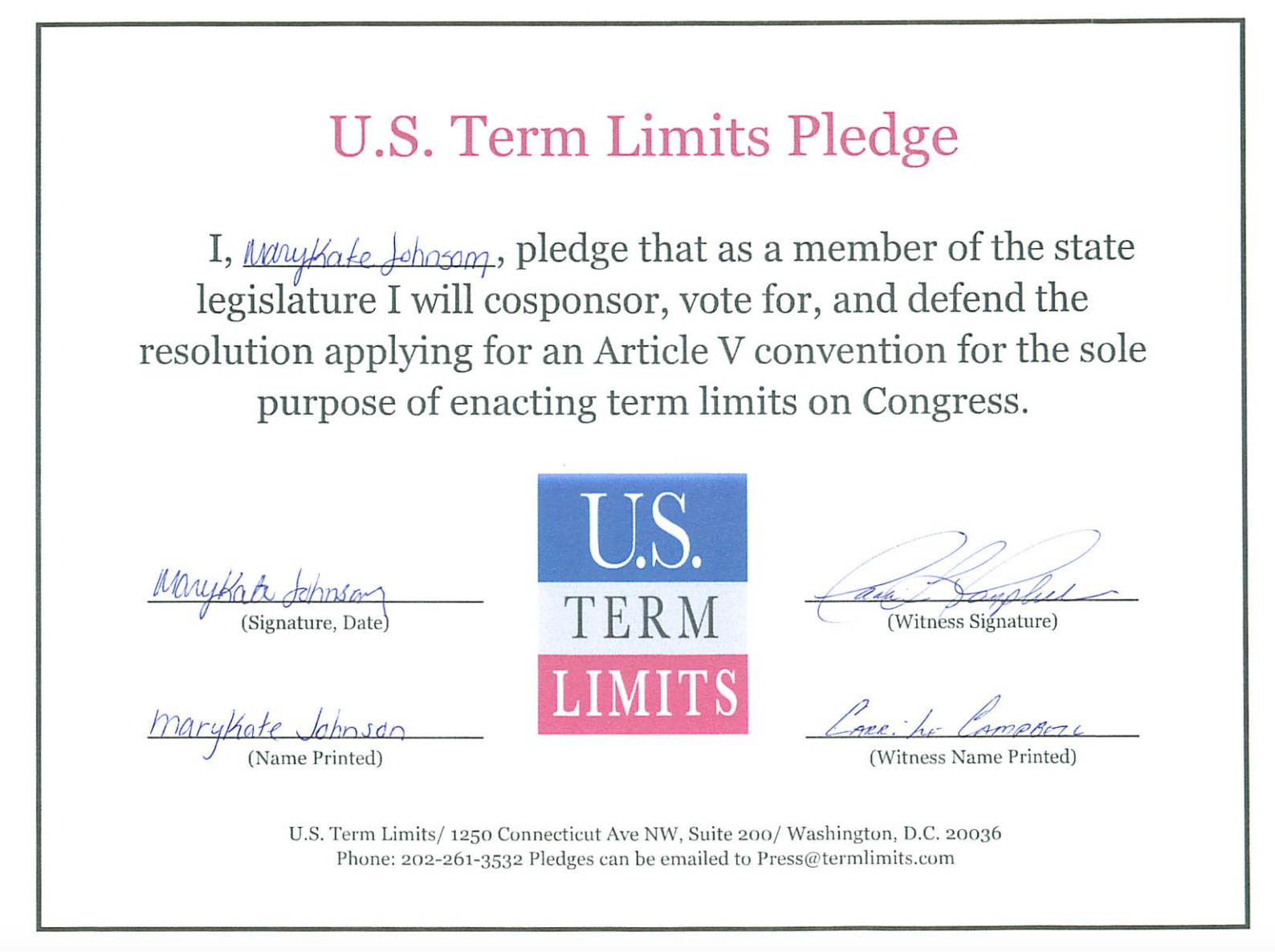 Mary-Kate Johnson Pledges to Support Congressional Term Limits
