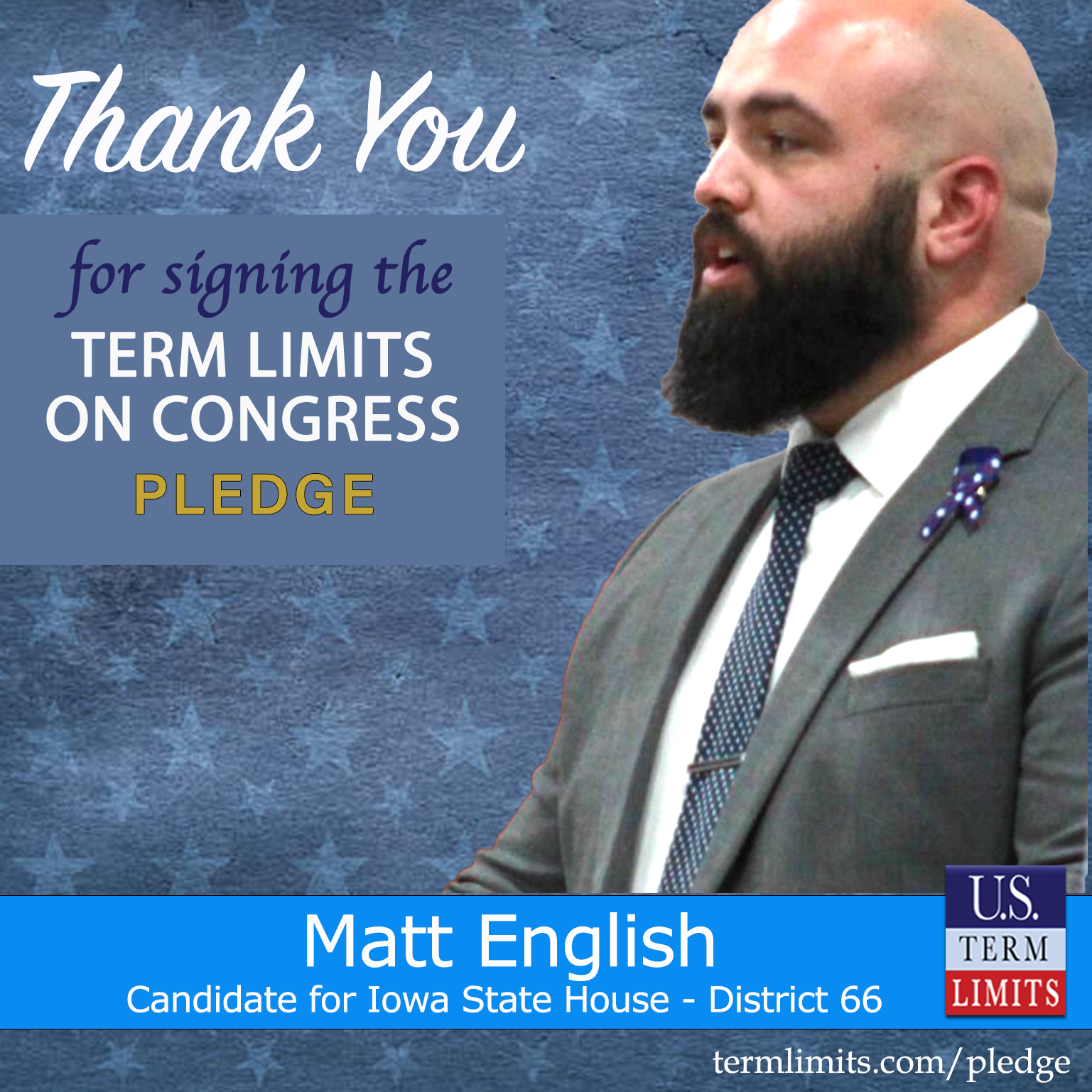 Anamosa, IA – U.S. Term Limits (USTL), the leader in the national, non-partisan movement to limit terms for elected officials, is gathering support from state lawmakers across the nation. Its mission is to get 34 states to apply for an amendment proposal convention specific to term limits on Congress. 2026 Iowa state house candidate, Matt English (district 66), has committed support for term limits on Congress by signing the term limits convention pledge.