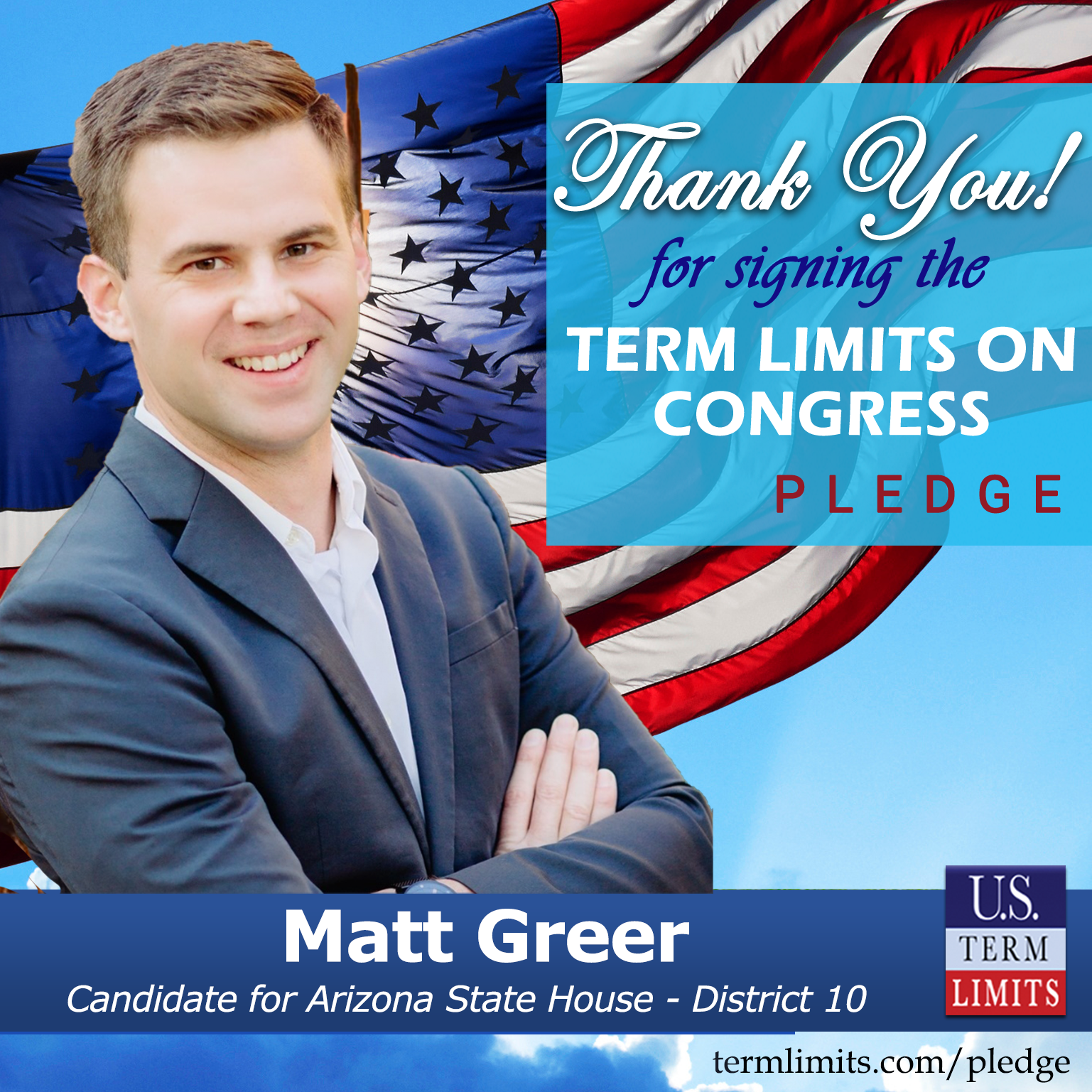 Apache Junction, AZ– U.S. Term Limits (USTL), the leader in the national, non-partisan movement to limit terms for elected officials, is gathering support from state lawmakers across the nation. Its mission is to get 34 states to apply for an amendment proposal convention specific to term limits on Congress. Arizona state house candidate, Matt Greer (District 10), has committed support for term limits on Congress by signing the term limits convention pledge. Greer is the first signer in this race.
