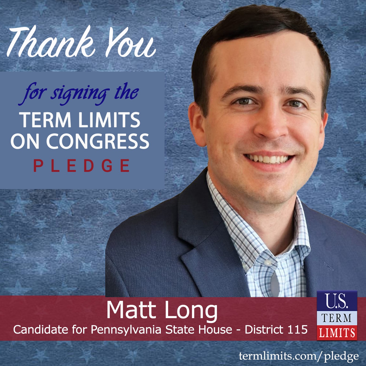 State Chair for U.S. Term Limits, John Eichelberger, commented on Long’s pledge saying, “Our founding fathers never envisioned a professional class of politicians. I am glad Matt agrees. He is committed to implementing term limits on Congress.”