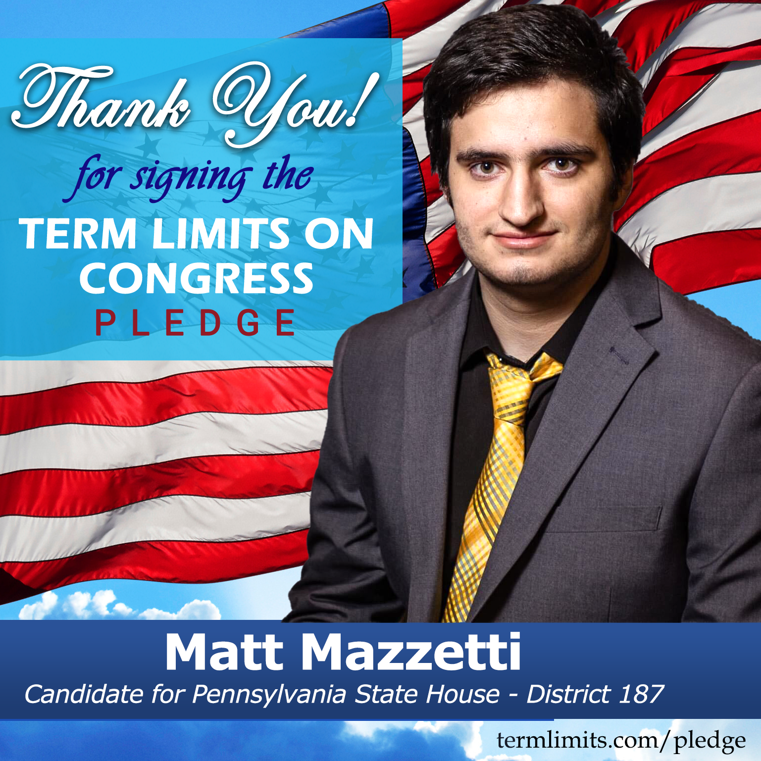 Macungie, PA– U.S. Term Limits (USTL), the leader in the national, non-partisan movement to limit terms for elected officials, is gathering support from state lawmakers across the nation. Its mission is to get 34 states to apply for an amendment proposal convention specific to term limits on Congress. Pennsylvania state house candidate, Matt Mazzetti (District 187), has committed support for term limits on Congress by signing the term limits convention pledge.