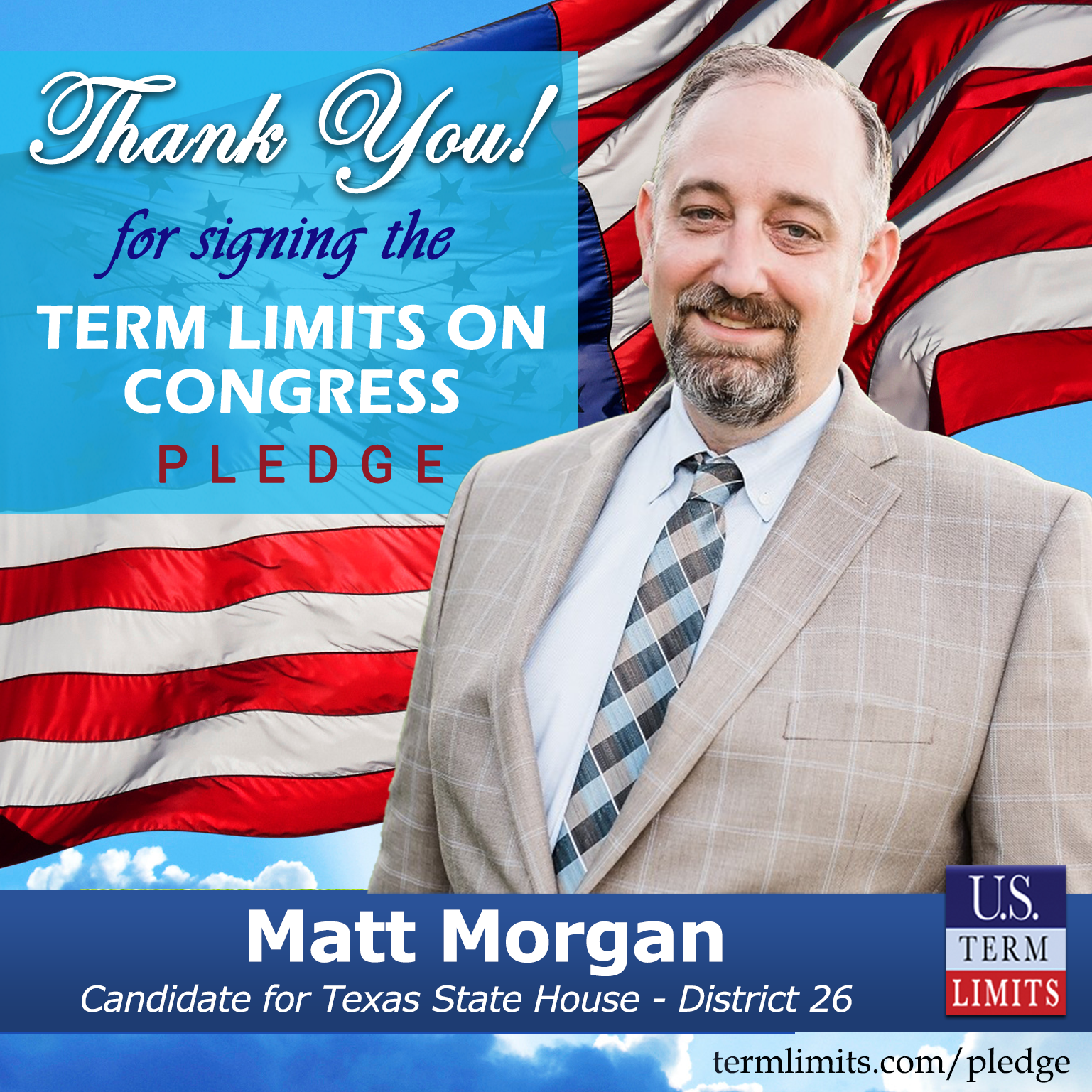 USTL President, Philip Blumel, commented on Morgan’s pledge saying, “Matt’s strong support of term limits shows that there are individuals who are willing to listen to the majority of voters who want term limits. America needs a Congress that will be served by citizen legislators, not career politicians.”
