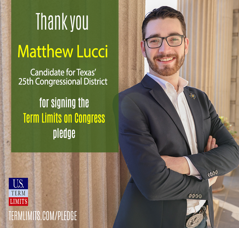 Washington D.C. – U.S. Term Limits (USTL), the leader in the non-partisan national movement to limit terms for elected officials, praises 2024 U.S. House candidate for Texas, Matthew Lucci (District 25), for signing the pledge for an amendment to term limit Congress. Lucci is the first signer in this race.