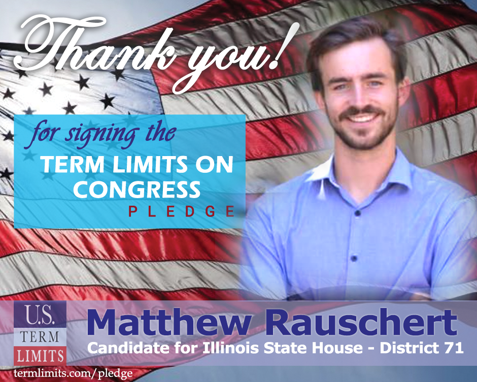 Springfield, IL – U.S. Term Limits (USTL), the leader in the national, non-partisan movement to limit terms for elected officials, is gathering support from state lawmakers across the nation. Its mission is to get 34 states to apply for an amendment proposal convention specific to term limits on Congress. Illinois state house candidate, Matthew Rauschert (district 71) has committed support for term limits on Congress by signing the Term Limits Convention pledge.