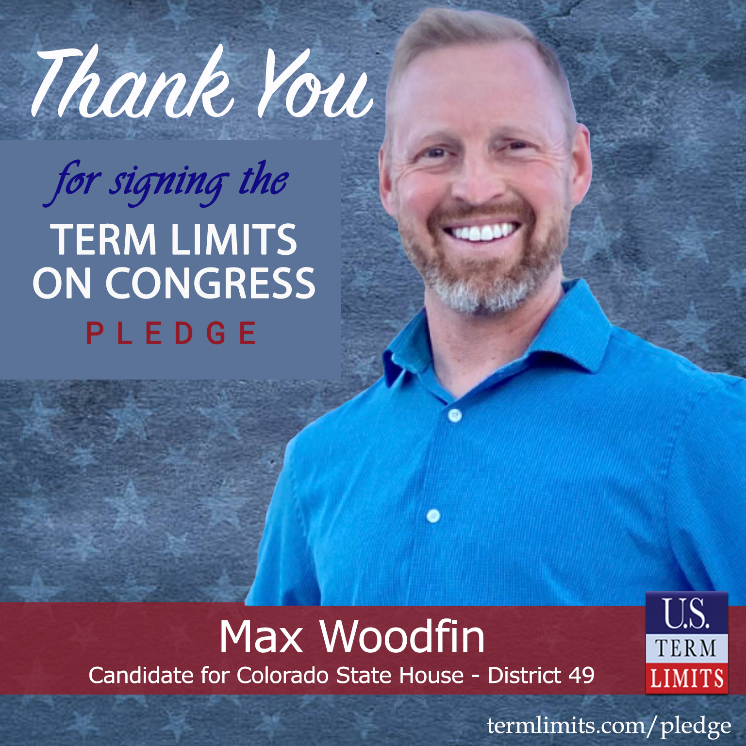 Boulder, CO – U.S. Term Limits (USTL), the leader in the national, non-partisan movement to limit terms for elected officials, is gathering support from state lawmakers across the nation. Its mission is to get 34 states to apply for an amendment proposal convention specific to term limits on Congress. Colorado state house candidate, Max Woodfin (District 49), has committed support for term limits on Congress by signing the term limits convention pledge.