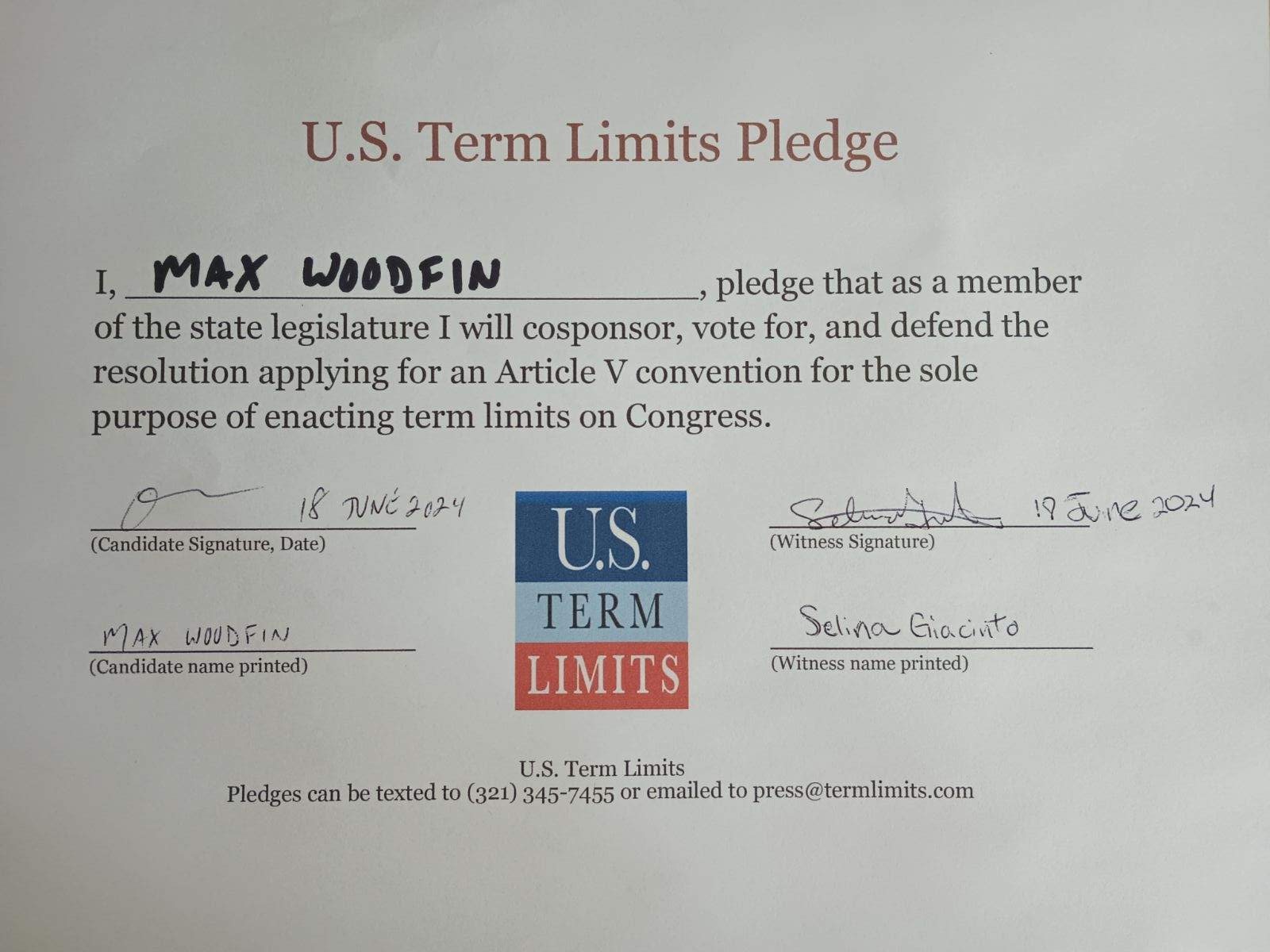 Max Woodfin Pledges to Support Congressional Term Limits