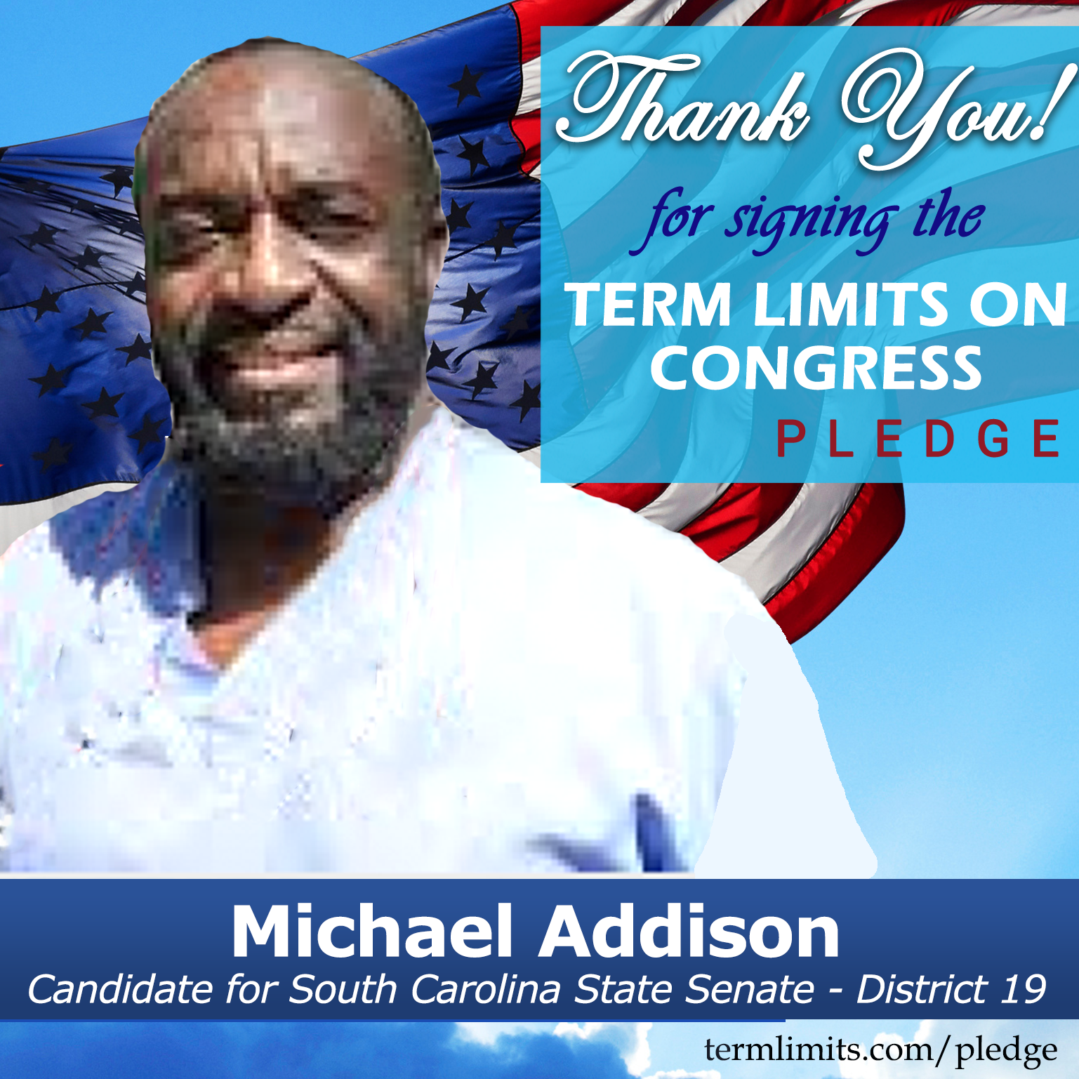 Columbia, SC – U.S. Term Limits (USTL), the leader in the national, non-partisan movement to limit terms for elected officials, is gathering support from state lawmakers across the nation. Its mission is to get 34 states to apply for an amendment proposal convention specific to term limits on Congress. South Carolina state senate candidate, Michael Addison (District 19), has committed support for term limits on Congress by signing the term limits convention pledge. Previously, candidate Kizzie Smalls also signed the pledge.