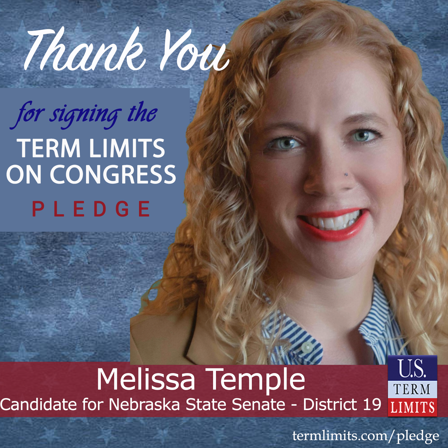 Lincoln, NE – U.S. Term Limits (USTL), the leader in the national, non-partisan movement to limit terms for elected officials, is gathering support from state lawmakers across the nation. Its mission is to get 34 states to apply for an amendment proposal convention specific to term limits on Congress. Nebraska state senate candidate, Melissa Temple (District 19), has committed support for term limits on Congress by signing the term limits convention pledge. Previously, Senator Bob Dover also signed the pledge.