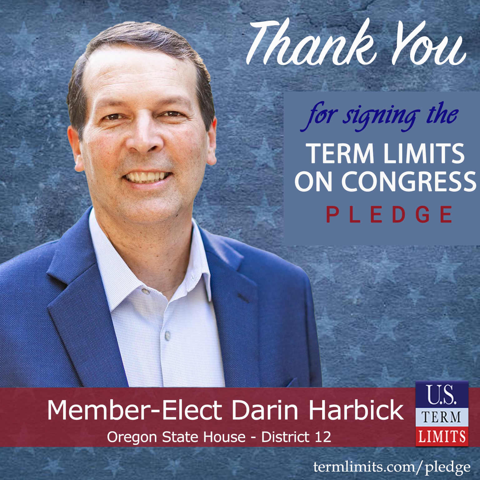 U.S. Term Limits State Chair Alek Skarlatos commented on Darin’s pledge, stating, “I am excited that Harbick has signed the term limits pledge. Darin understands that we need a citizen legislature not one of career politicians who become more disconnected from the people they were elected to serve by every passing year. Harbick’s support will help move this forward.