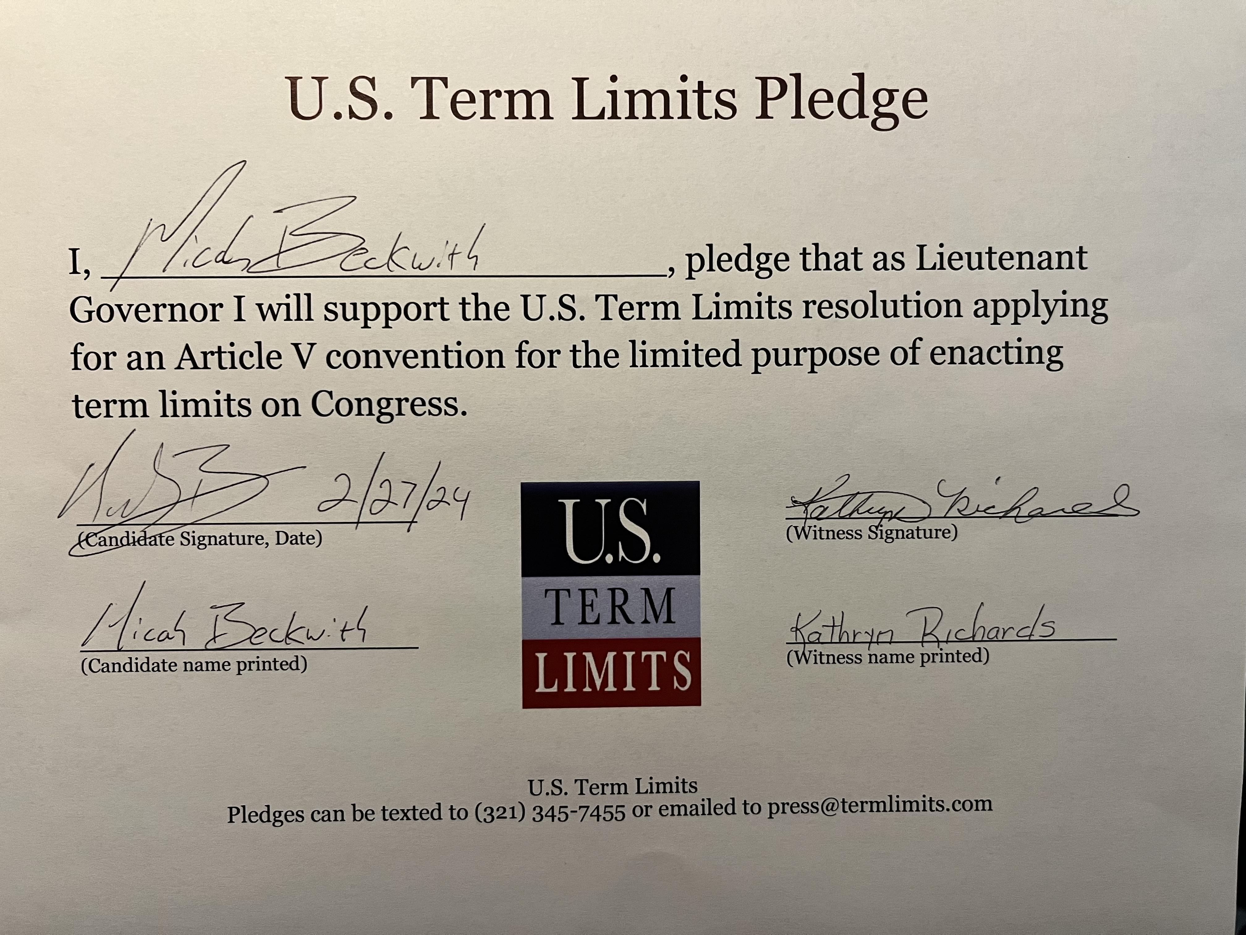 The U.S. Term Limits pledge is provided to candidates and members of state legislatures. It reads, “I pledge that as Lieutenant Governor, I will support the U.S. Term Limits resolution applying for an Article V convention for the limited purpose of enacting term limits on Congress.”