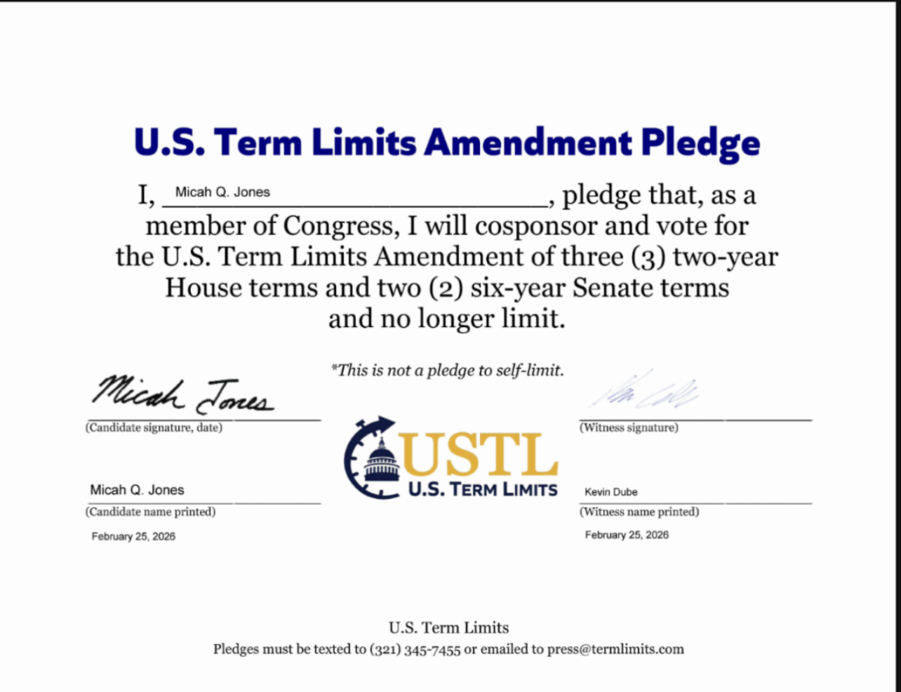 Washington D.C. – U.S. Term Limits (USTL), the leader in the non-partisan national movement to limit terms for elected officials, praises 2026 U.S. Representative candidate for Massachusetts, Micah Jones (district 6), for signing the pledge for an amendment to term limit Congress.