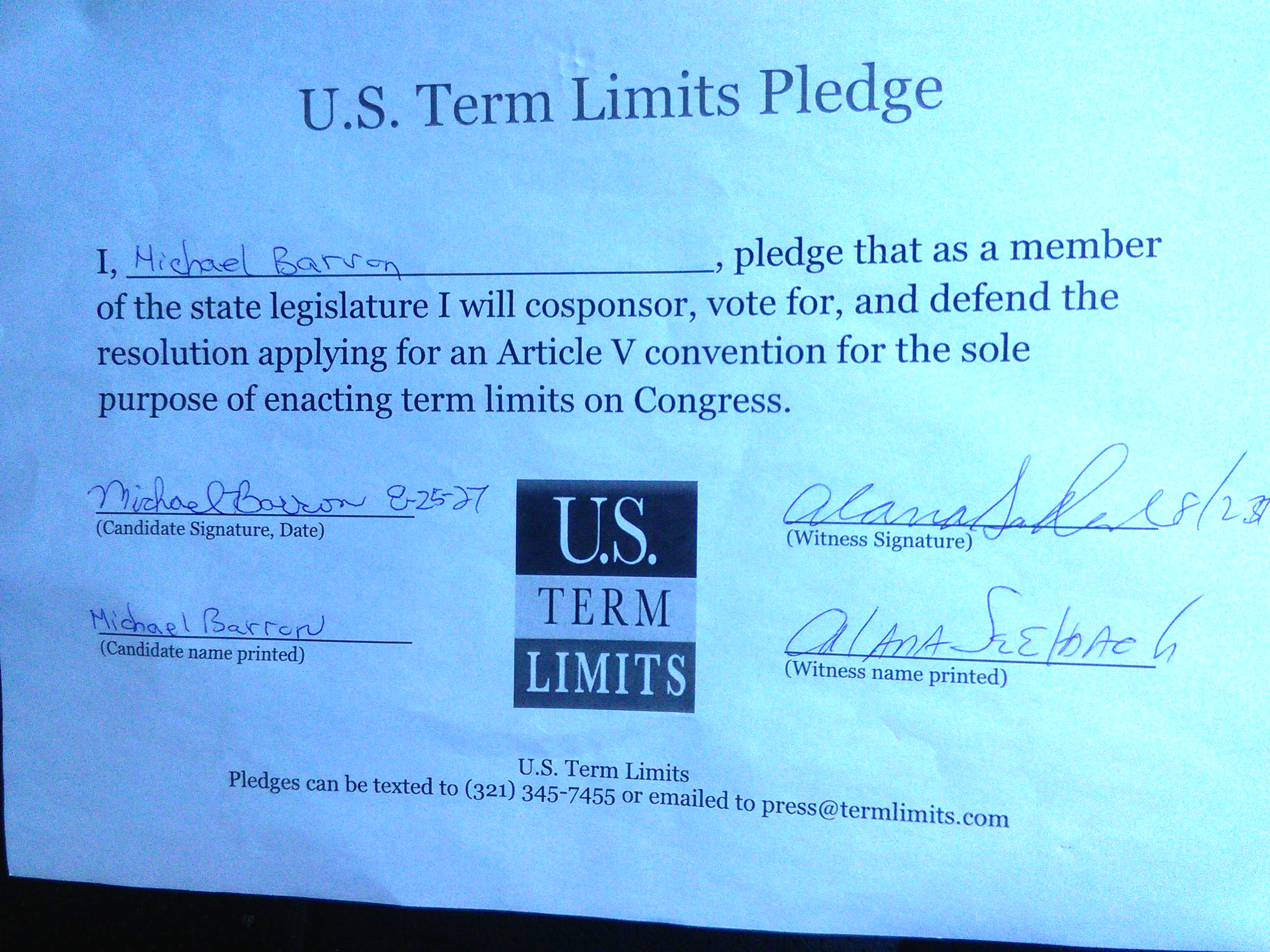 Topeka, KS – U.S. Term Limits (USTL), the leader in the national, non-partisan movement to limit terms for elected officials, is gathering support from state lawmakers across the nation. Its mission is to get 34 states to apply for an amendment proposal convention specific to term limits on Congress. Kansas state senate candidate, Michael Barron (District 55), has committed support for term limits on Congress by signing the term limits convention pledge.