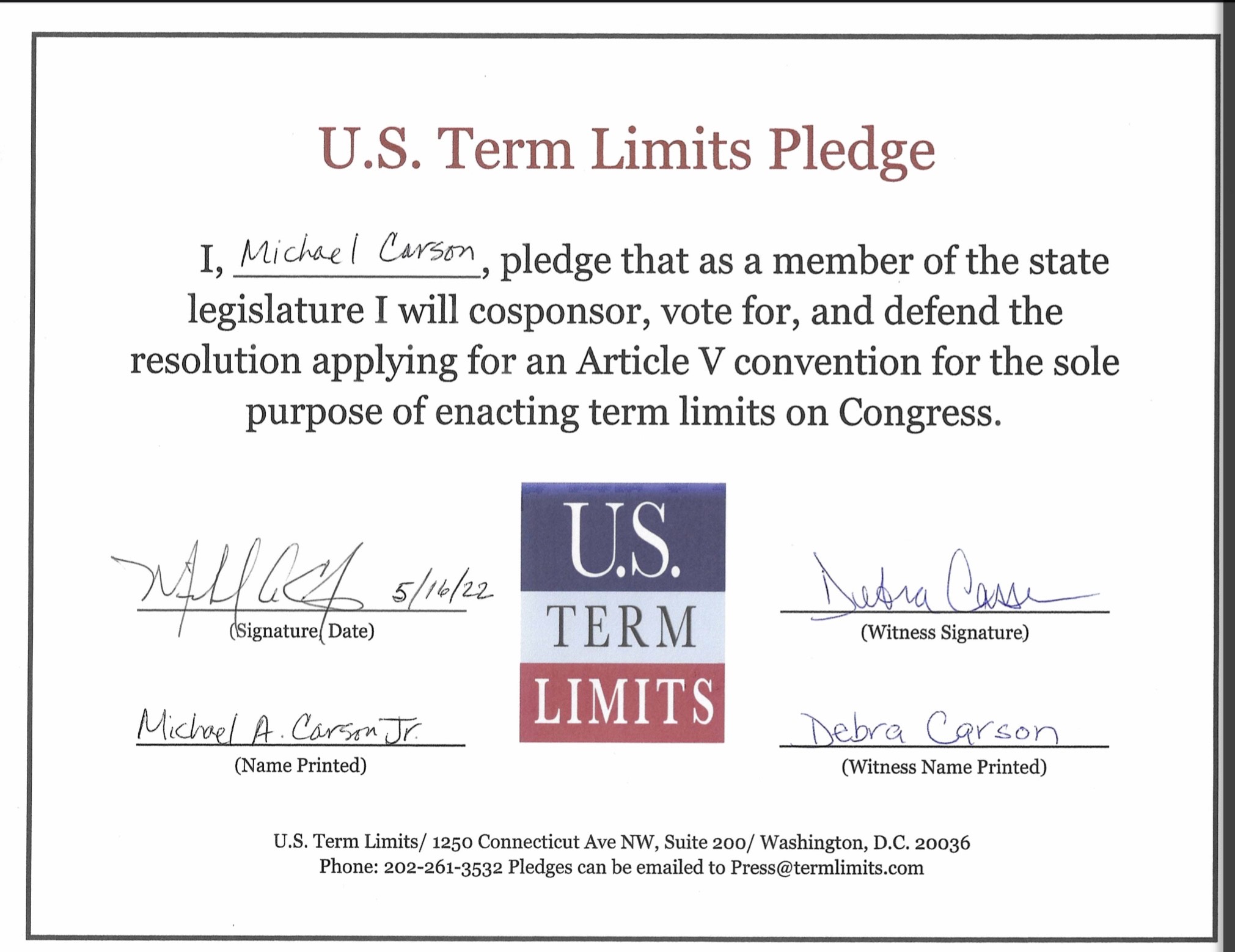 USTL President, Philip Blumel, commented on Carson’s pledge saying, “Michael’s support of term limits shows that there are individuals who are willing to listen to the majority of voters who want term limits. America needs a Congress that will be served by citizen legislators, not career politicians.”