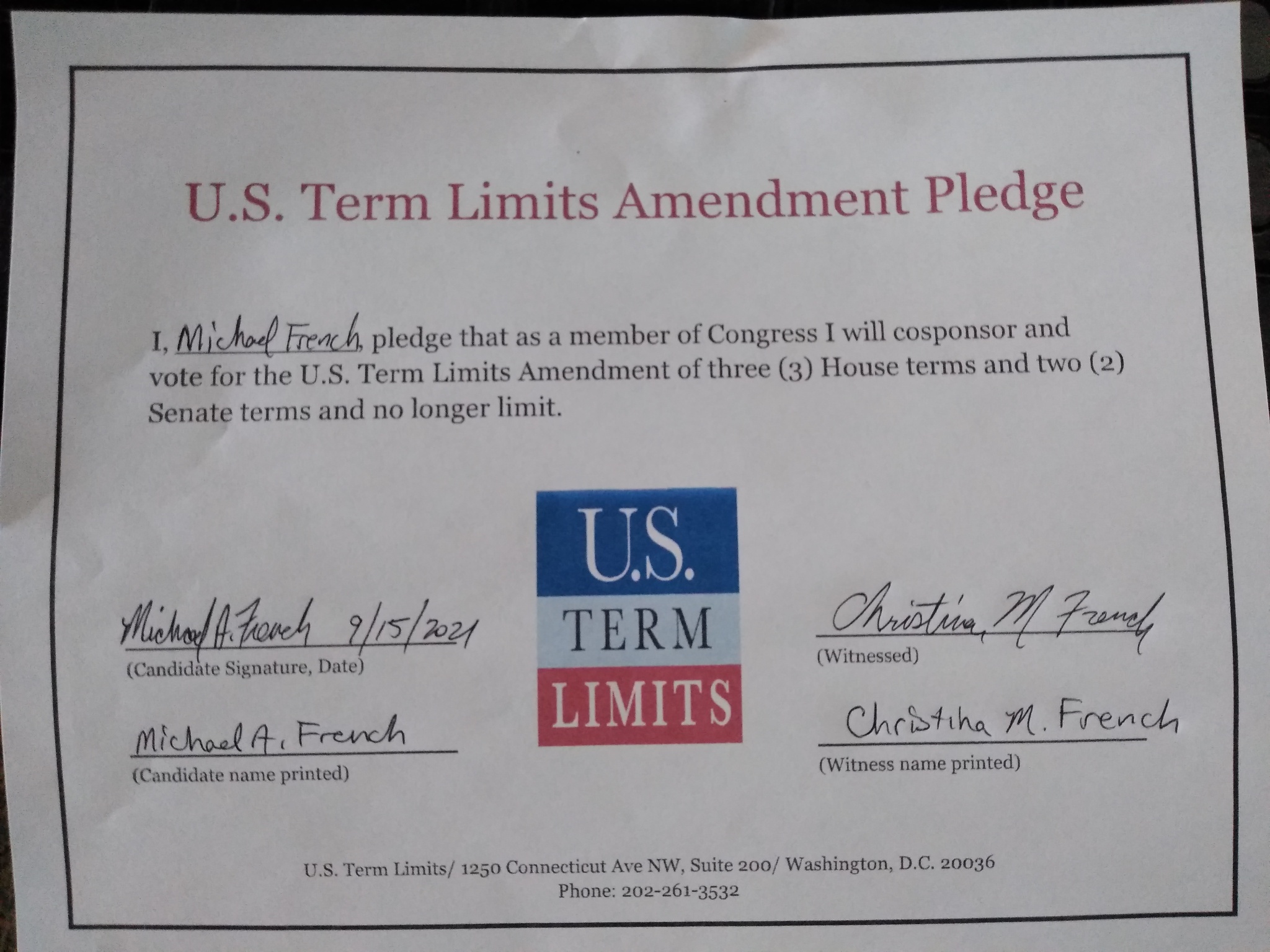 Washington D.C. – U.S. Term Limits (USTL), the leader in the non-partisan national movement to limit terms for elected officials, praises 2022 U.S. house candidate for Texas, Michael French (district 21), for signing the pledge for an amendment to term limit Congress. Previously, candidates Robert Lowry and MT “Smitty” Smith also signed the pledge.