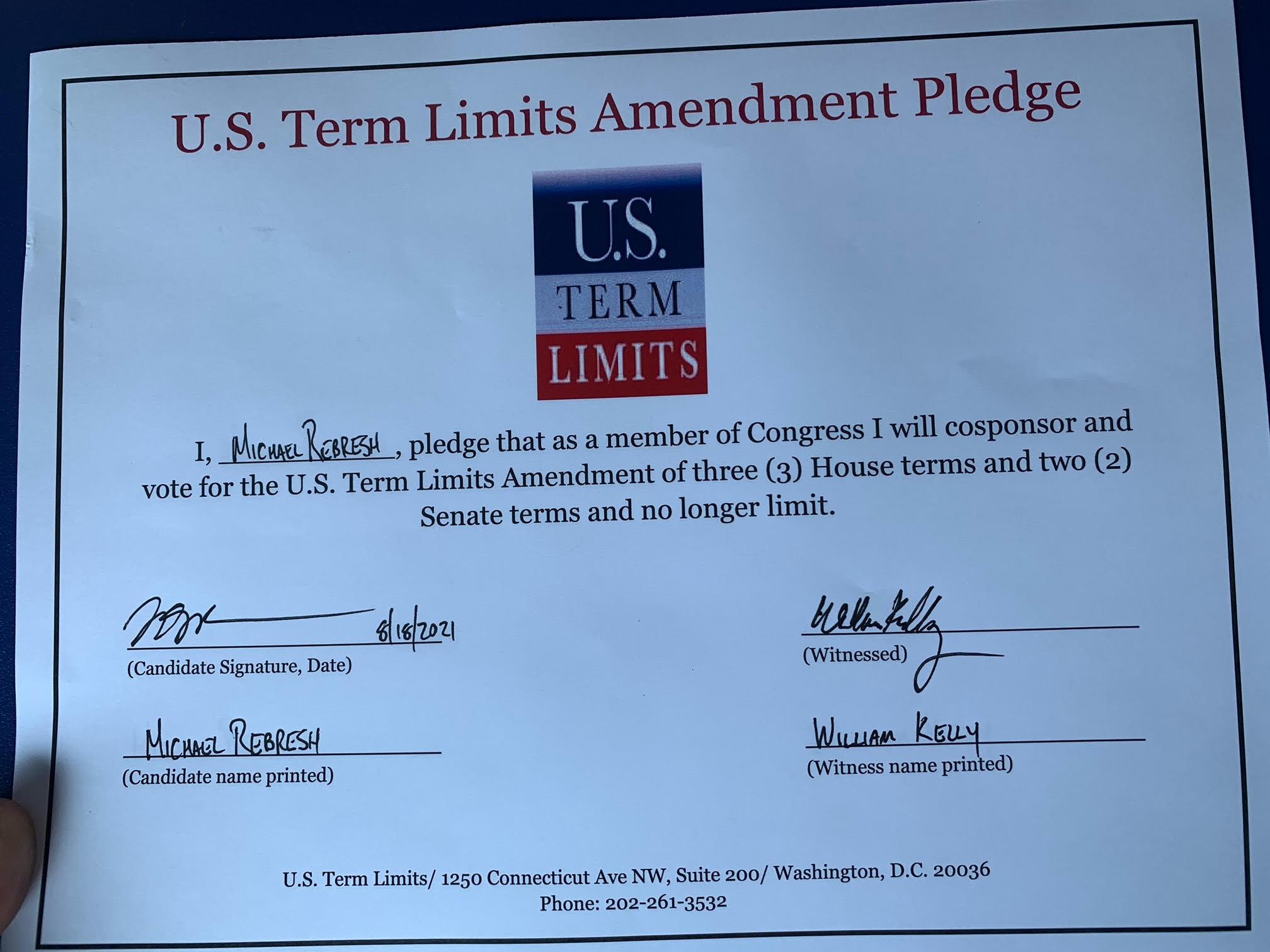 Michael Rebresh Pledges to Support Term Limits on Congress