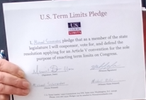 The U.S. Term Limits pledge is provided to candidates and members of state legislatures. It reads, “I pledge that, as a member of the state legislature, I will cosponsor, vote for, and defend the resolution applying for an Article V convention for the limited purpose of enacting term limits on Congress.”