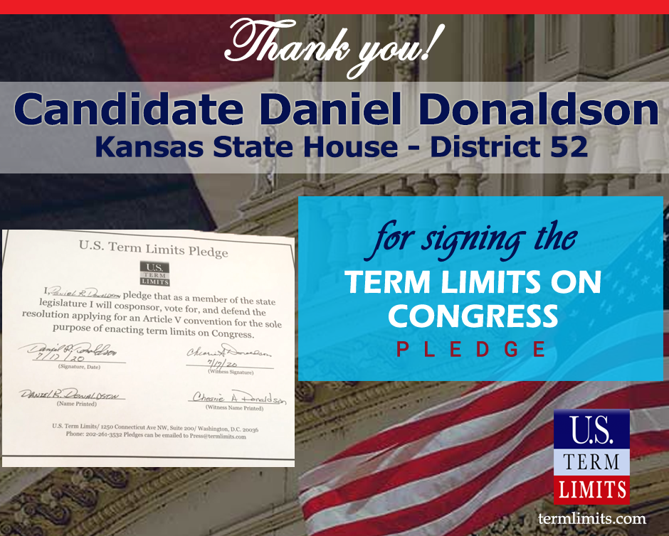 The U.S. Term Limits pledge is provided to candidates and members of state legislatures. It reads, “I pledge that, as a member of the state legislature, I will cosponsor, vote for, and defend the resolution applying for an Article V convention for the sole purpose of enacting term limits on Congress.”