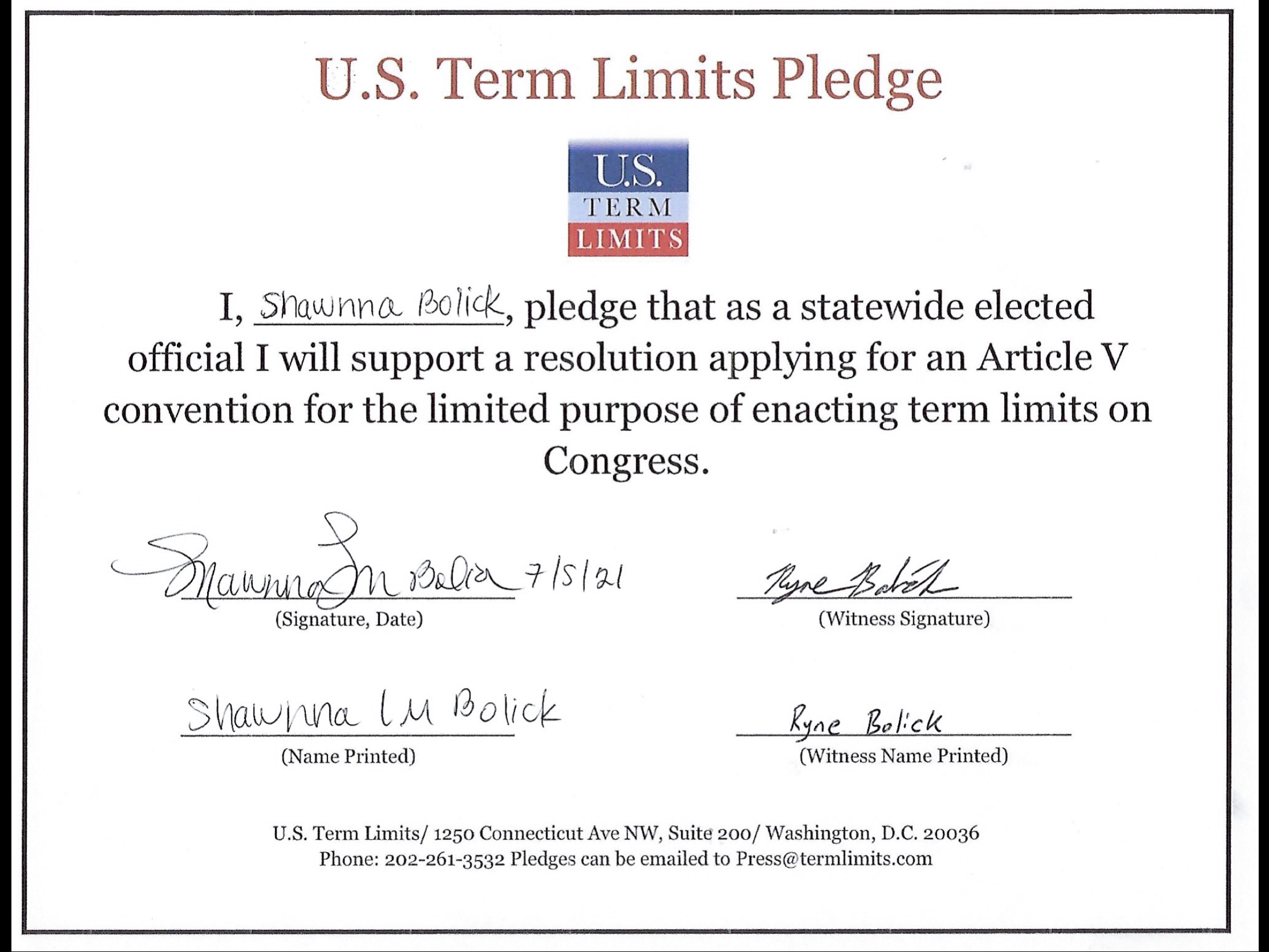 The U.S. Term Limits pledge is provided to candidates and elected officials. It reads, “I pledge that, as a statewide elected official, I will support and vote for the resolution applying for an Article V convention for the limited purpose of enacting term limits on Congress.”