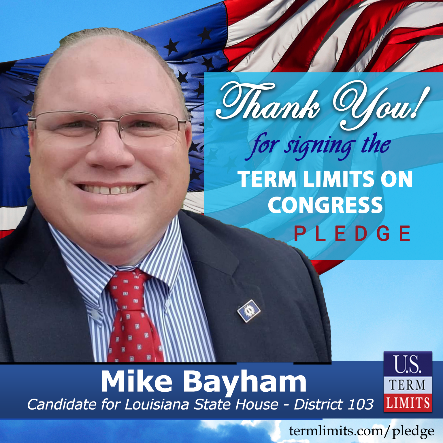 New Orleans, LA – U.S. Term Limits (USTL), the leader in the national, non-partisan movement to limit terms for elected officials, is gathering support from state lawmakers across the nation. Its mission is to get 34 states to apply for an amendment proposal convention specific to term limits on Congress. Louisiana state house candidate, Mike Bayham (District 103), has committed support for term limits on Congress by signing the term limits convention pledge. Bayham is the first signer in this race.